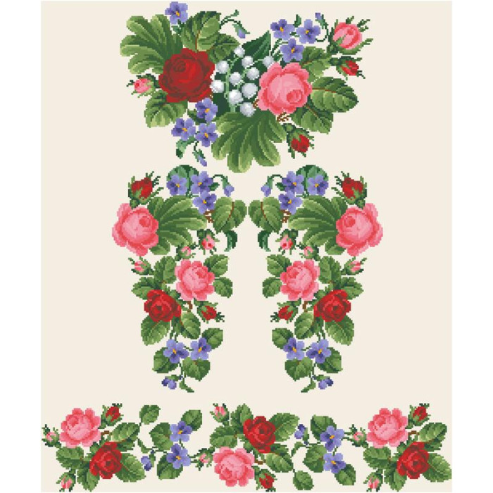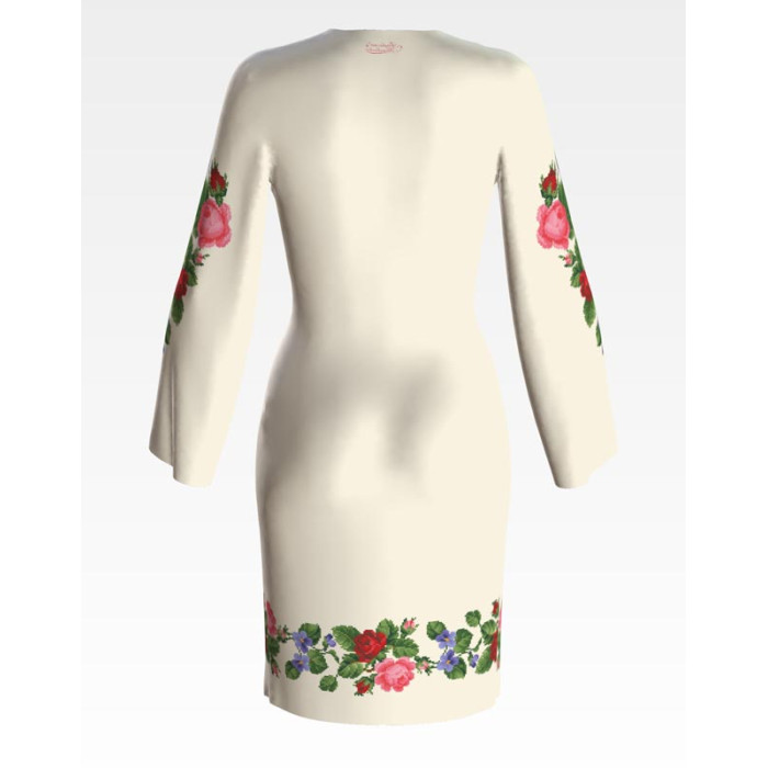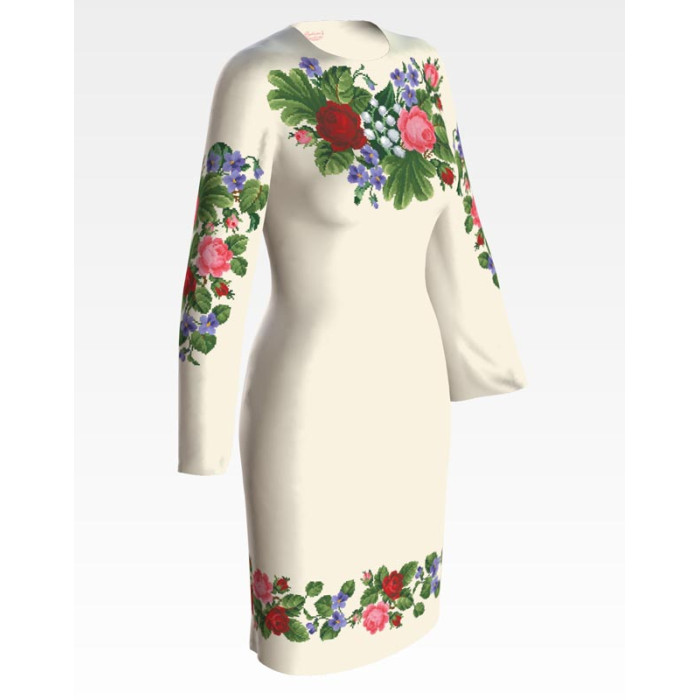Заготовка для вишивки жіночої сукні Троянди, фіалки, конвалії призначена для часткової зашивки бісером або нитками. Схема надрукована на льоні бежевого кольору екологічно чистими стійкими фарбами, що не змиваються після прання. Відрізи розкроєні з урахуванням необхідних запасів для зручного вишивання та подальшого пошиття виробу.
