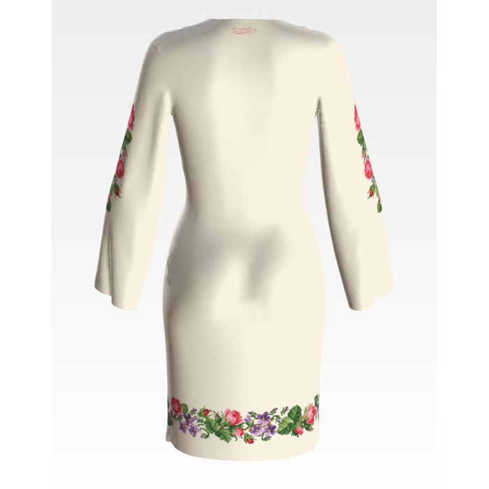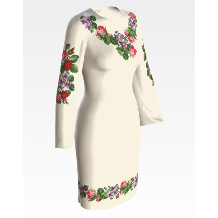 Заготовка для вишивки жіночої сукні Троянди і фіалки призначена для часткової зашивки бісером або нитками. Схема надрукована на домотканому полотні бежевого кольору екологічно чистими стійкими фарбами, що не змиваються після прання. Відрізи розкроєні з урахуванням необхідних запасів для зручного вишивання та подальшого пошиття виробу.