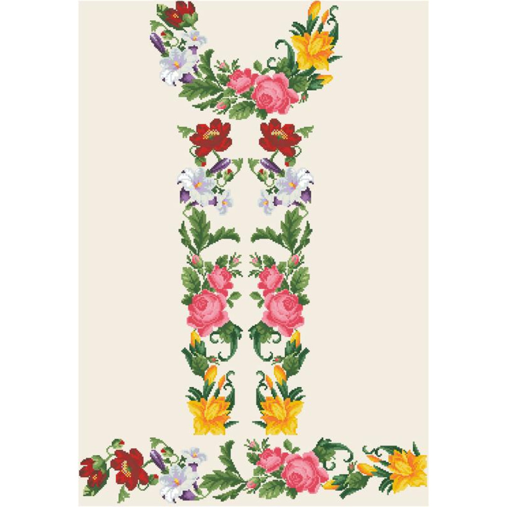 Заготовка для вишивки жіночої сукні Королівські квіти призначена для часткової зашивки бісером або нитками. Схема надрукована на атлас-котоні бежевого кольору екологічно чистими стійкими фарбами, що не змиваються після прання. Відрізи розкроєні з урахуванням необхідних запасів для зручного вишивання та подальшого пошиття виробу.