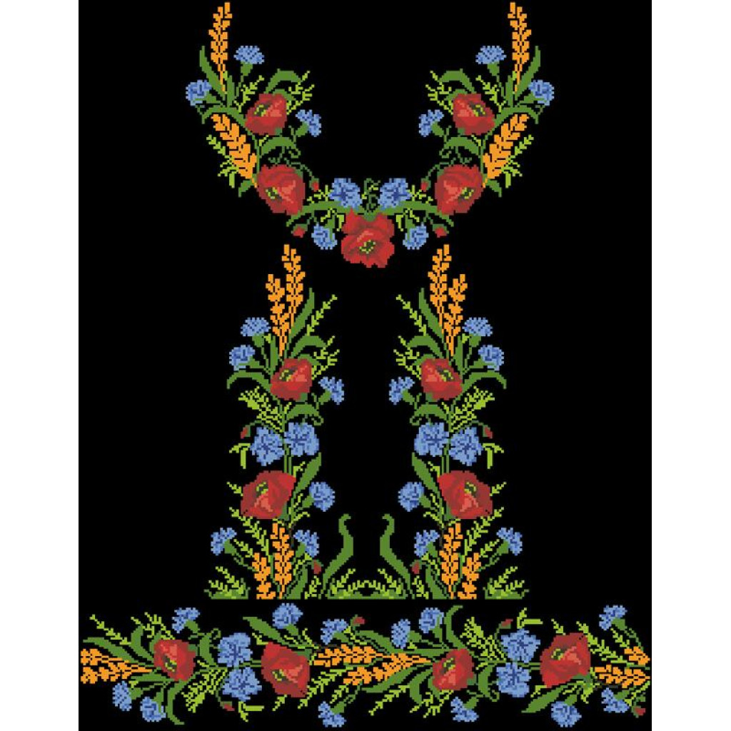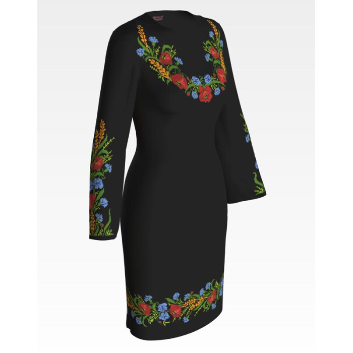 Заготовка для вишивки жіночої сукні Польові квіти призначена для часткової зашивки бісером або нитками. Схема надрукована на льоні чорного кольору екологічно чистими стійкими фарбами, що не змиваються після прання. Відрізи розкроєні з урахуванням необхідних запасів для зручного вишивання та подальшого пошиття виробу.
