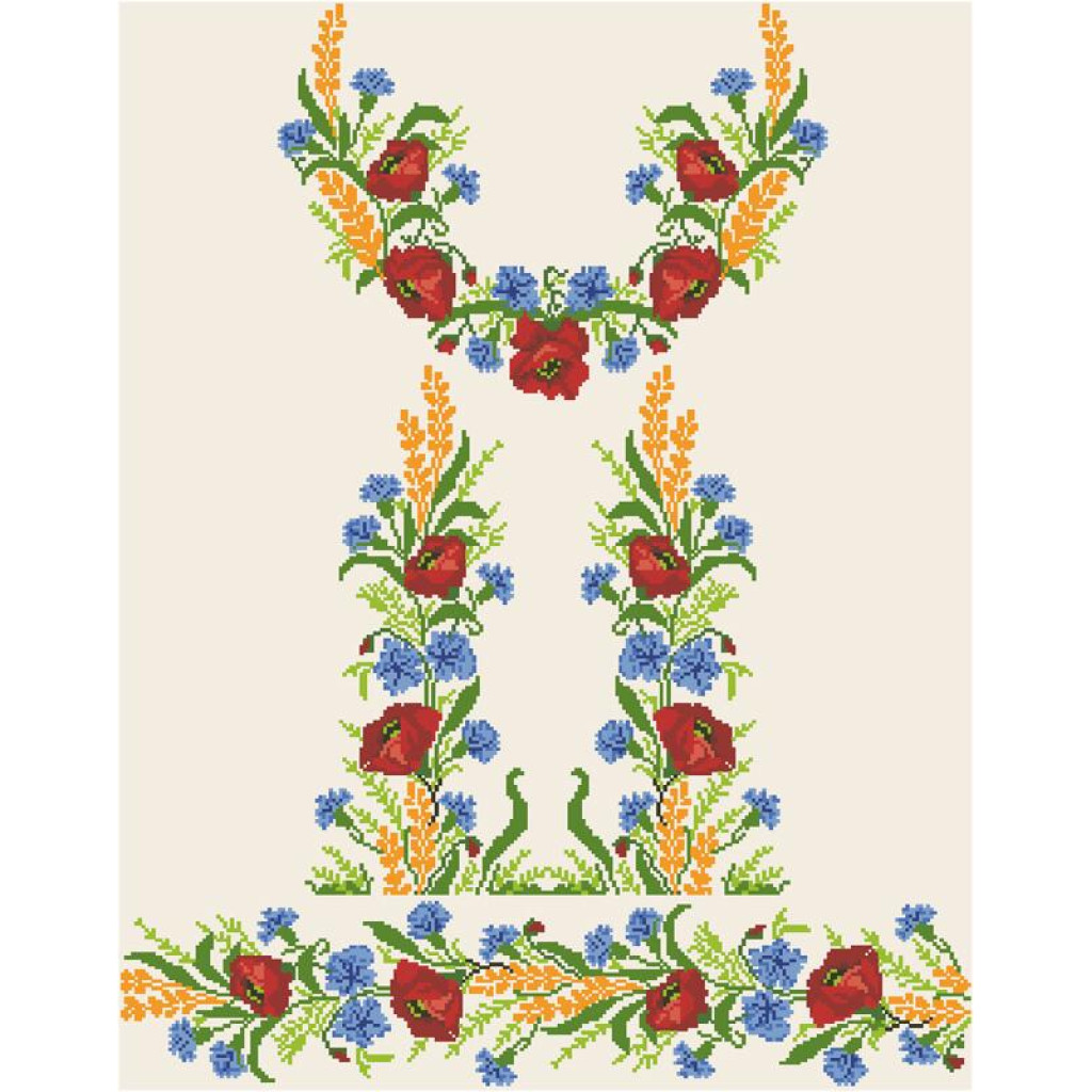 Заготовка для вишивки жіночої сукні Польові квіти призначена для часткової зашивки бісером або нитками. Схема надрукована на льоні бежевого кольору екологічно чистими стійкими фарбами, що не змиваються після прання. Відрізи розкроєні з урахуванням необхідних запасів для зручного вишивання та подальшого пошиття виробу.