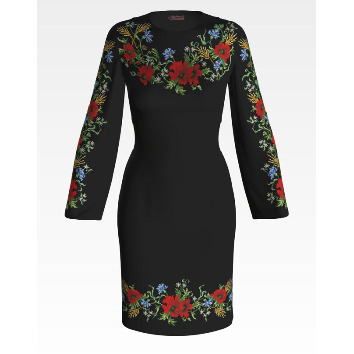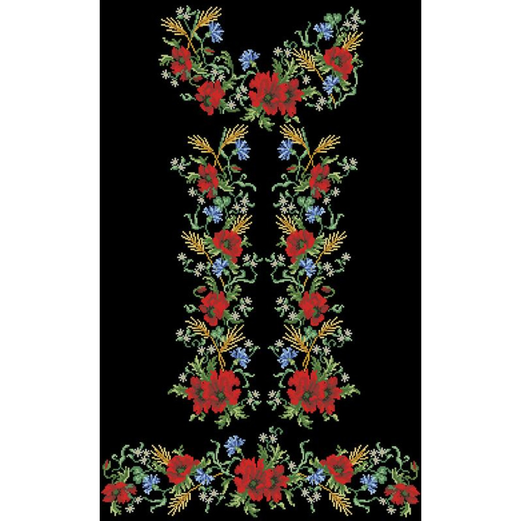 Заготовка для вишивки жіночої сукні Ніжні маки, волошки, колоски призначена для часткової зашивки бісером або нитками. Схема надрукована на льоні чорного кольору екологічно чистими стійкими фарбами, що не змиваються після прання. Відрізи розкроєні з урахуванням необхідних запасів для зручного вишивання та подальшого пошиття виробу.
