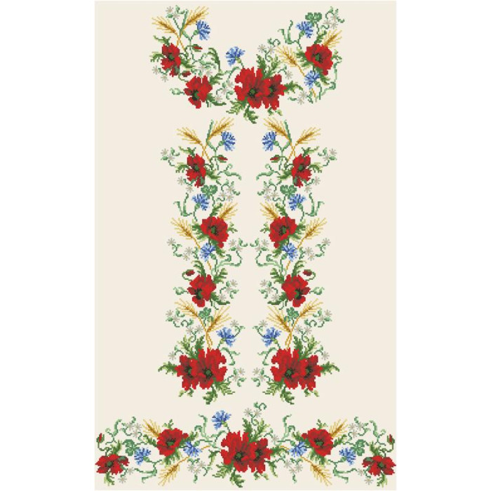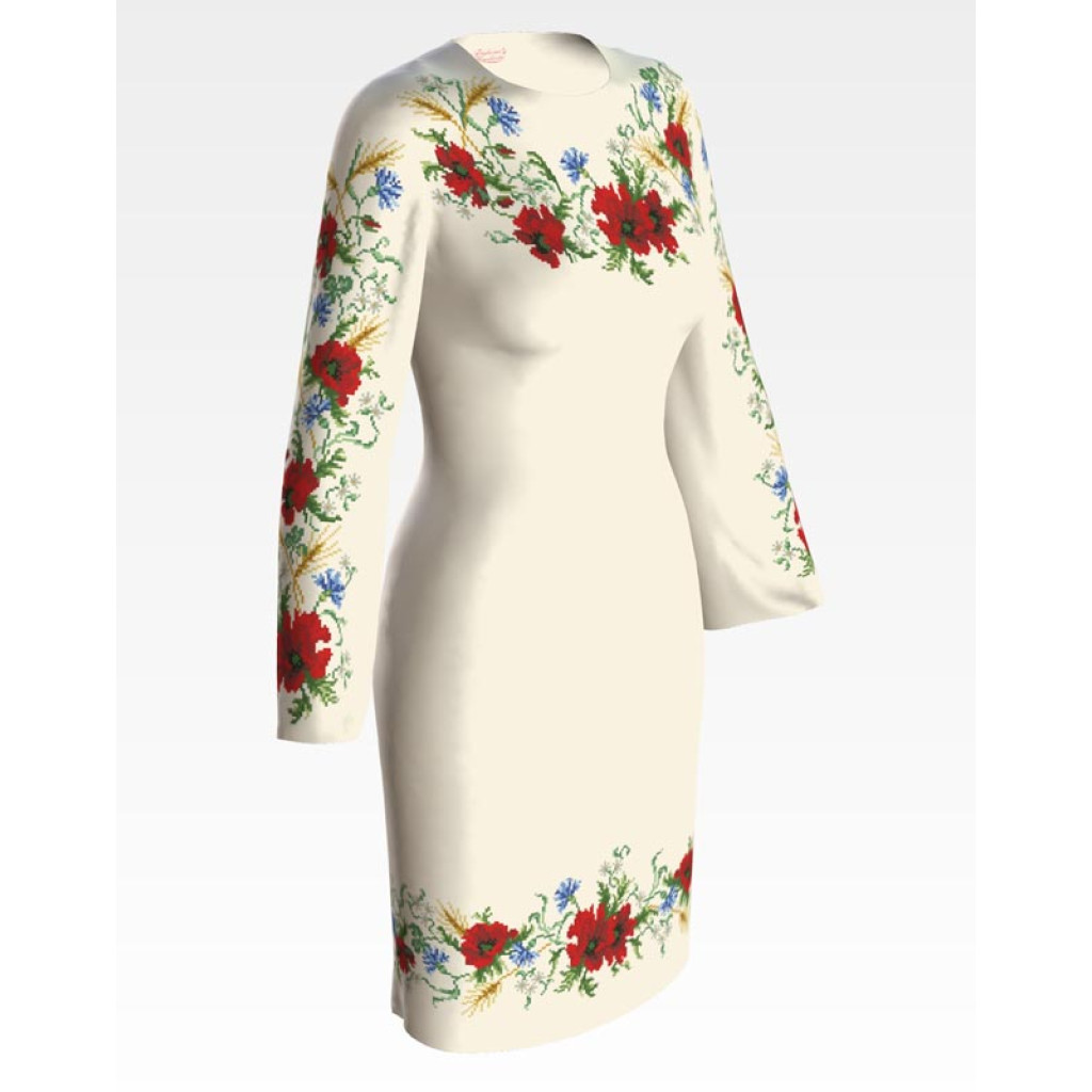 Заготовка для вишивки жіночої сукні Ніжні маки, волошки, колоски призначена для часткової зашивки бісером або нитками. Схема надрукована на льоні бежевого кольору екологічно чистими стійкими фарбами, що не змиваються після прання. Відрізи розкроєні з урахуванням необхідних запасів для зручного вишивання та подальшого пошиття виробу.