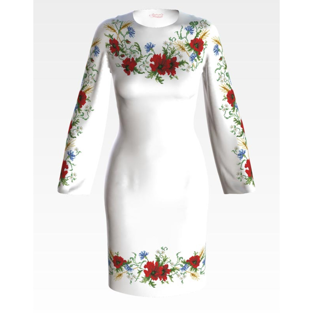 Заготовка для вишивки жіночої сукні Ніжні маки, волошки, колоски призначена для часткової зашивки бісером або нитками. Схема надрукована на білому габардині екологічно чистими стійкими фарбами, що не змиваються після прання. Відрізи розкроєні з урахуванням необхідних запасів для зручного вишивання та подальшого пошиття виробу.