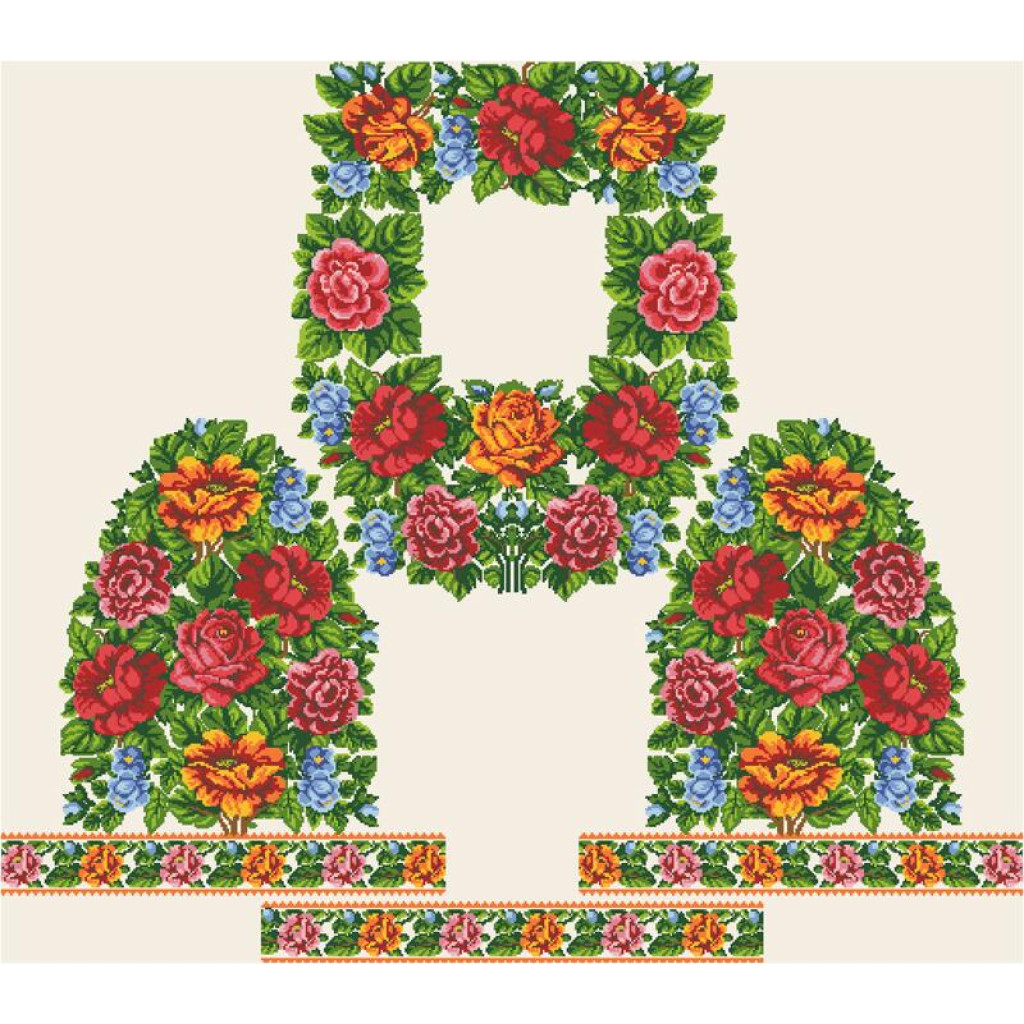 Заготовка для вишивки жіночої сукні Вишукана. Буковинська призначена для часткової зашивки бісером або нитками. Схема надрукована на атлас-котоні бежевого кольору екологічно чистими стійкими фарбами, що не змиваються після прання. Відрізи розкроєні з урахуванням необхідних запасів для зручного вишивання та подальшого пошиття виробу.