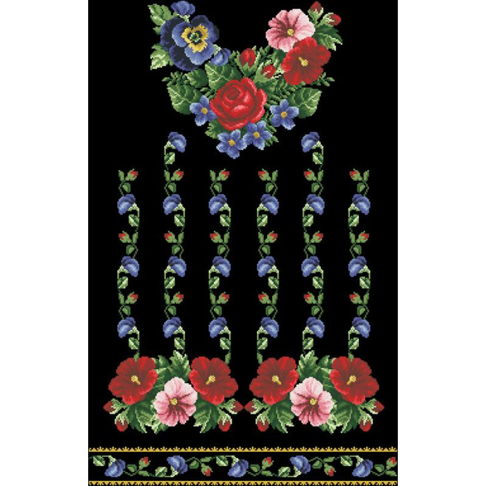 Заготовка для вишивки жіночої сукні Лілеї, троянди, незабудки призначена для часткової зашивки бісером або нитками. Схема надрукована на льоні чорного кольору екологічно чистими стійкими фарбами, що не змиваються після прання. Відрізи розкроєні з урахуванням необхідних запасів для зручного вишивання та подальшого пошиття виробу.