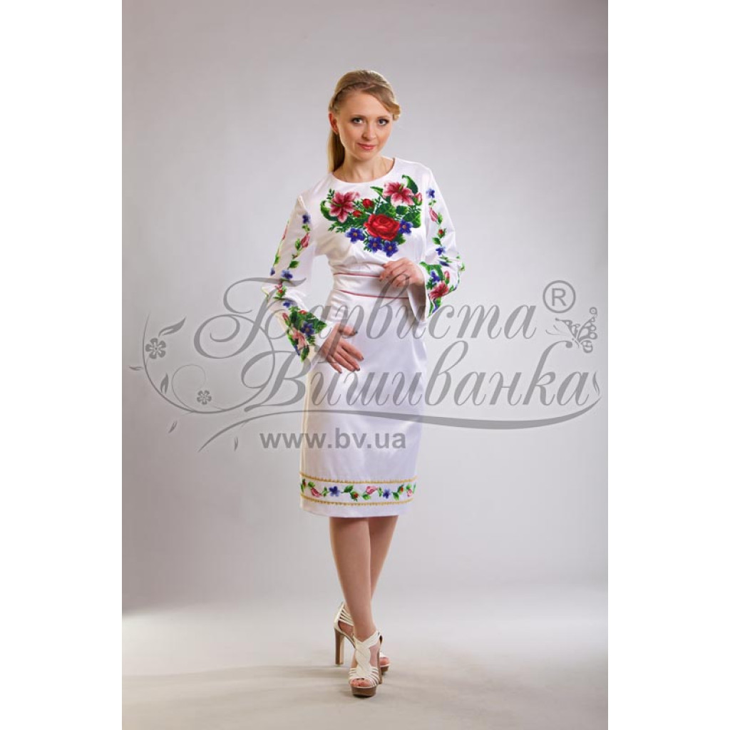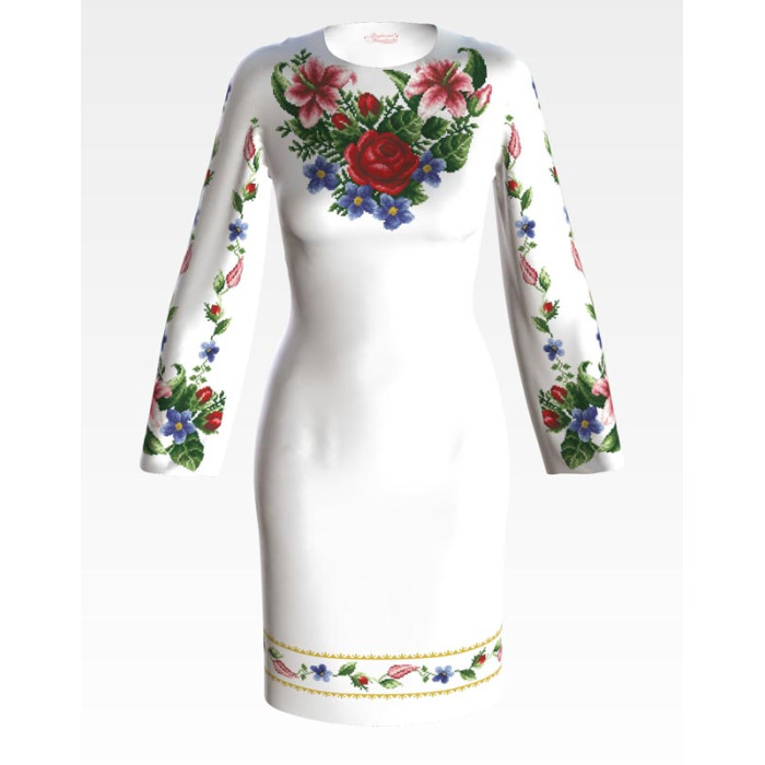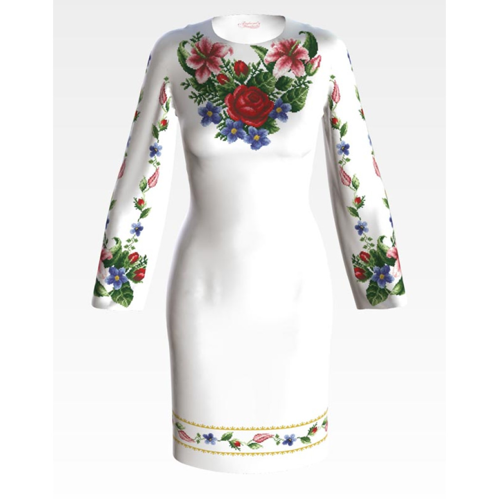 Заготовка для вишивки жіночої сукні Лілеї, троянди, незабудки призначена для часткової зашивки бісером або нитками. Схема надрукована на білому габардині екологічно чистими стійкими фарбами, що не змиваються після прання. Відрізи розкроєні з урахуванням необхідних запасів для зручного вишивання та подальшого пошиття виробу.