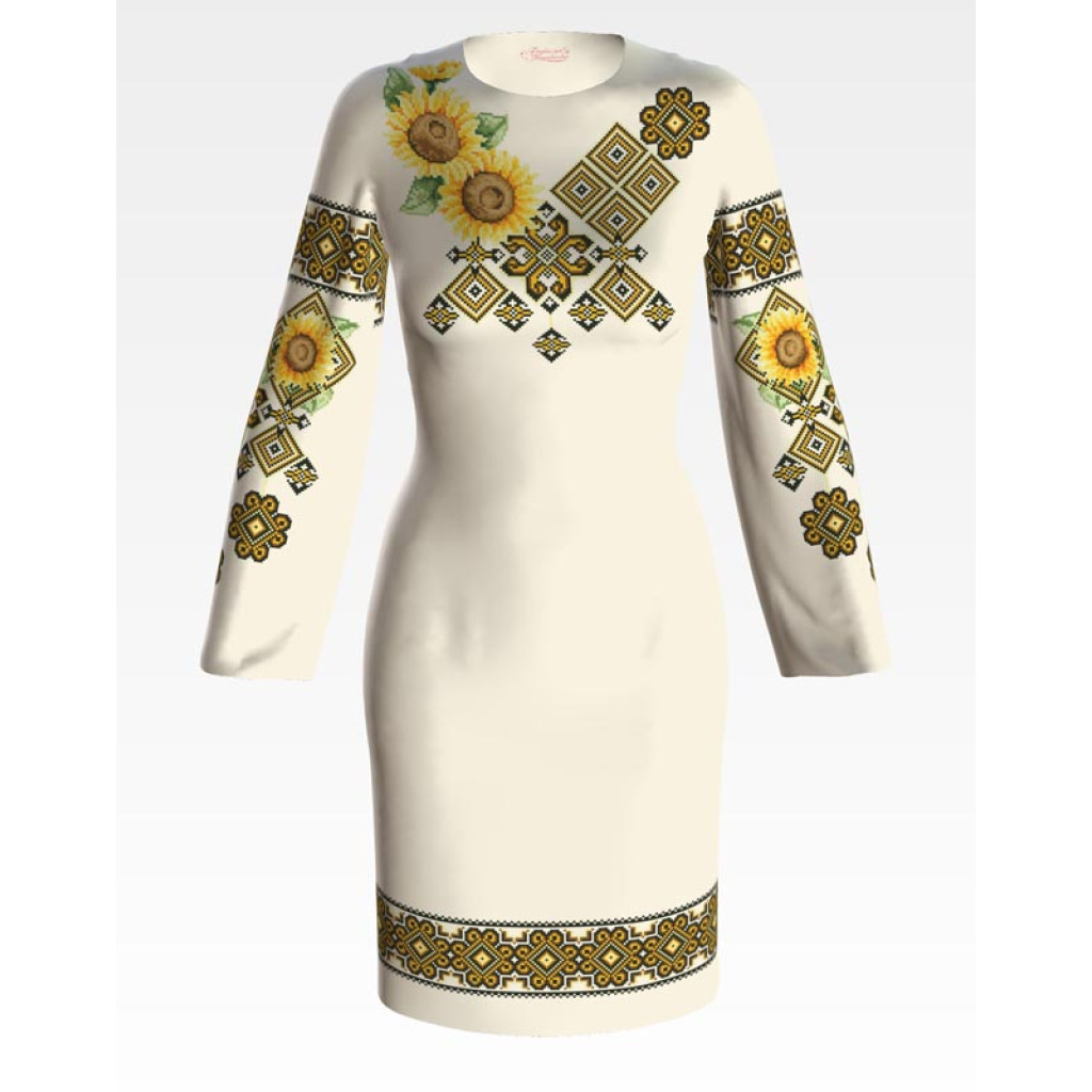Заготовка для вишивки жіночої сукні Сонячна призначена для часткової зашивки бісером або нитками. Схема надрукована на атлас-котоні бежевого кольору екологічно чистими стійкими фарбами, що не змиваються після прання. Відрізи розкроєні з урахуванням необхідних запасів для зручного вишивання та подальшого пошиття виробу.