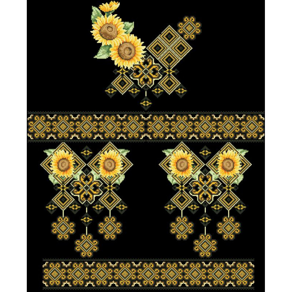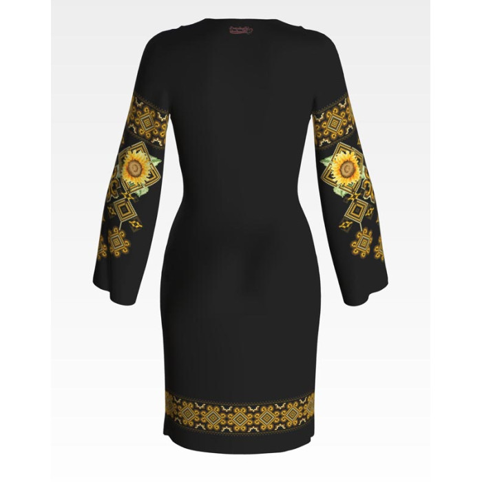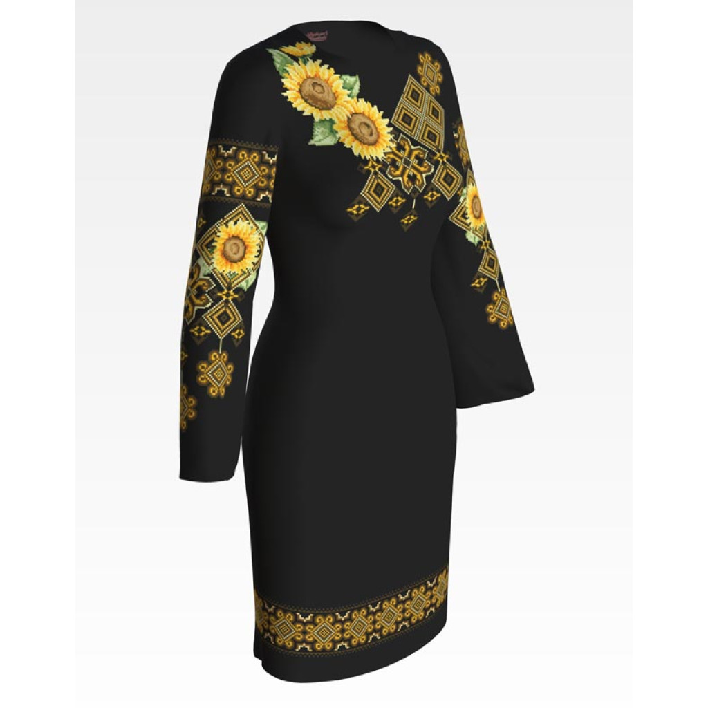 Заготовка для вишивки жіночої сукні Сонячна призначена для часткової зашивки бісером або нитками. Схема надрукована на шовковій тканині чорного кольору екологічно чистими стійкими фарбами, що не змиваються після прання. Відрізи розкроєні з урахуванням запасів для зручного вишивання та подальшого пошиття виробу.