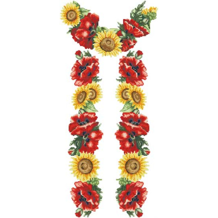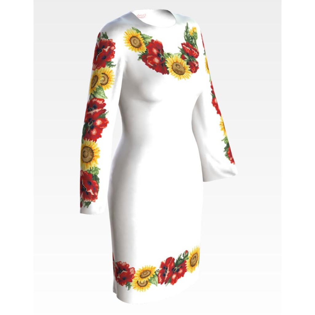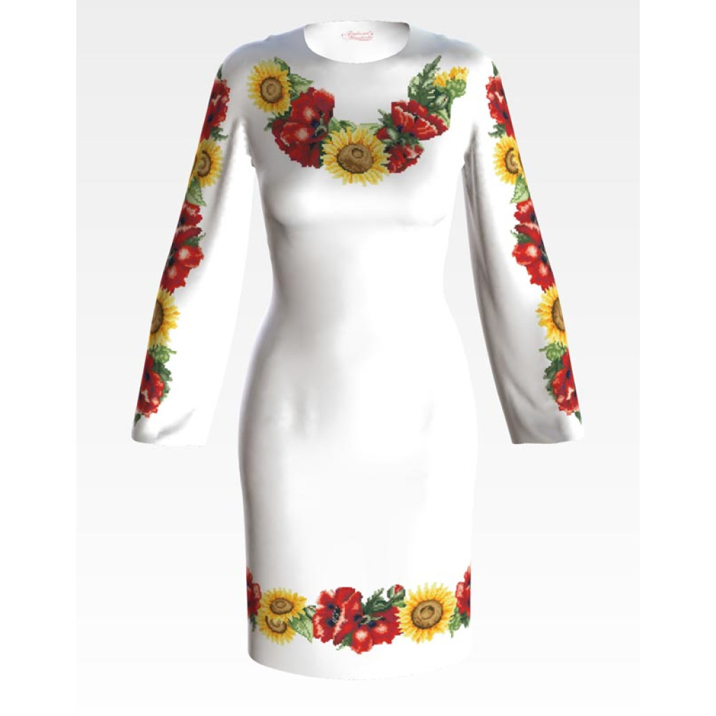 Заготовка для вишивки жіночої сукні Маки і соняхи призначена для часткової зашивки бісером або нитками. Схема надрукована на білому габардині екологічно чистими стійкими фарбами, що не змиваються після прання. Відрізи розкроєні з урахуванням необхідних запасів для зручного вишивання та подальшого пошиття виробу.