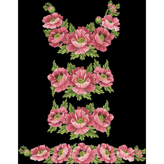 Заготовка для вишивки жіночої сукні Маки рожеві призначена для часткової зашивки бісером або нитками. Схема надрукована на льоні чорного кольору екологічно чистими стійкими фарбами, що не змиваються після прання. Відрізи розкроєні з урахуванням необхідних запасів для зручного вишивання та подальшого пошиття виробу.