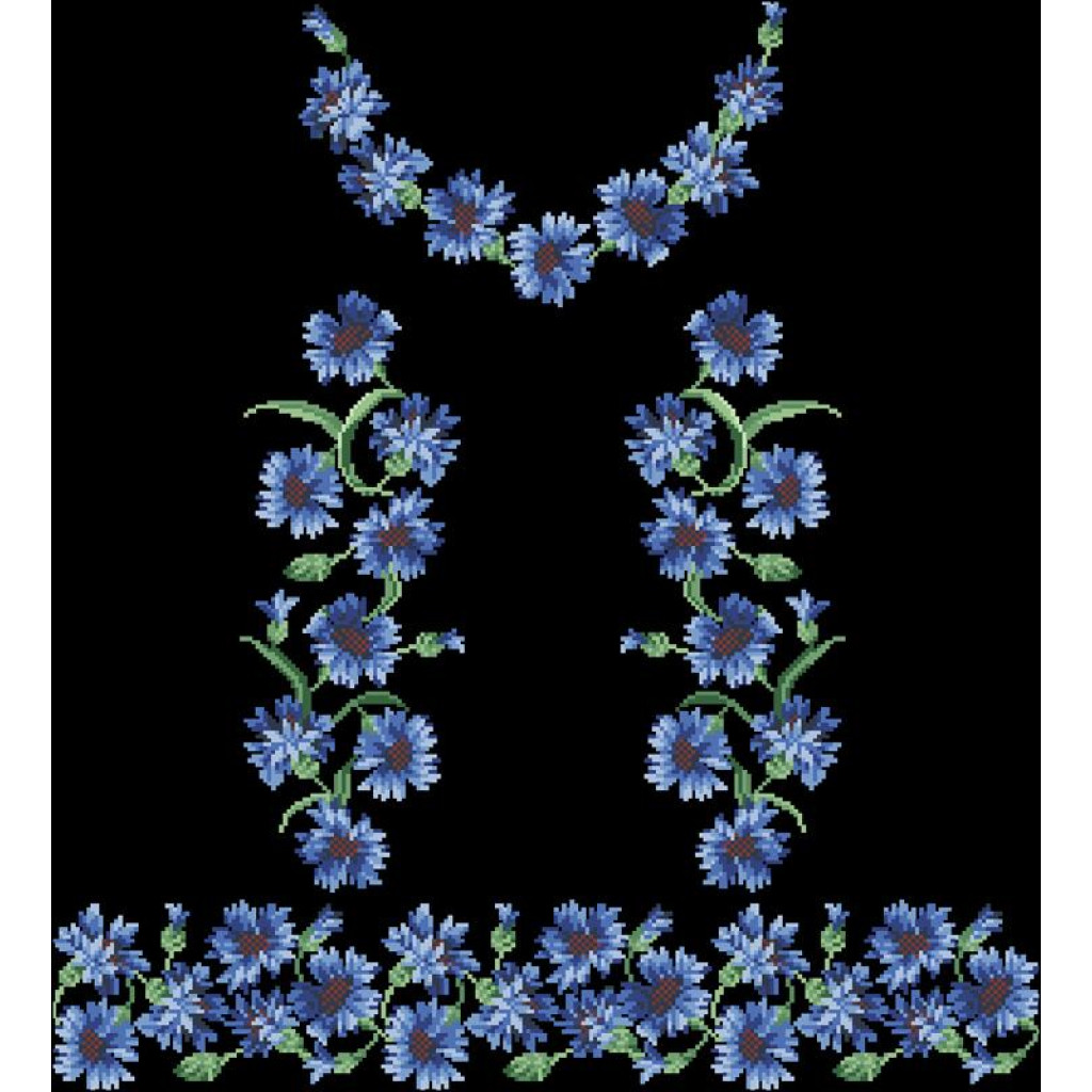 Заготовка для вишивки жіночої сукні Волошки призначена для часткової зашивки бісером або нитками. Схема надрукована на шовковій тканині чорного кольору екологічно чистими стійкими фарбами, що не змиваються після прання. Відрізи розкроєні з урахуванням запасів для зручного вишивання та подальшого пошиття виробу.