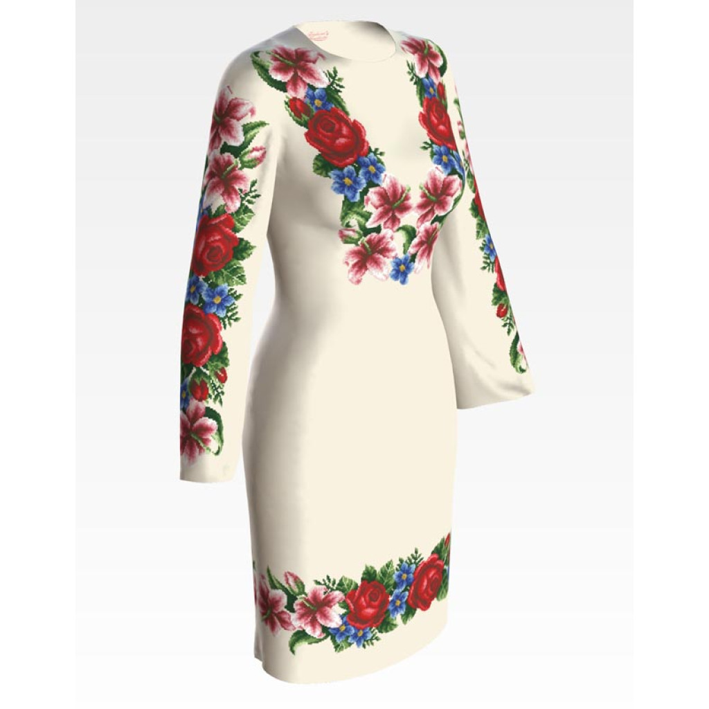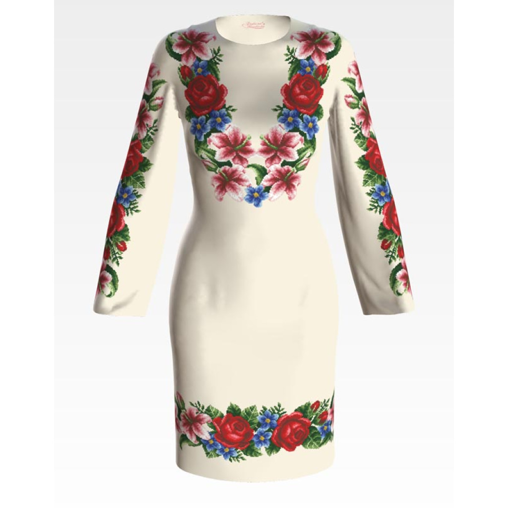 ПЛ055кМнннн Барвиста вишиванка Заготовка для вишивки - Сукня жіноча Лілеї, троянди, незабудки р.42-54 атлас, бежевий