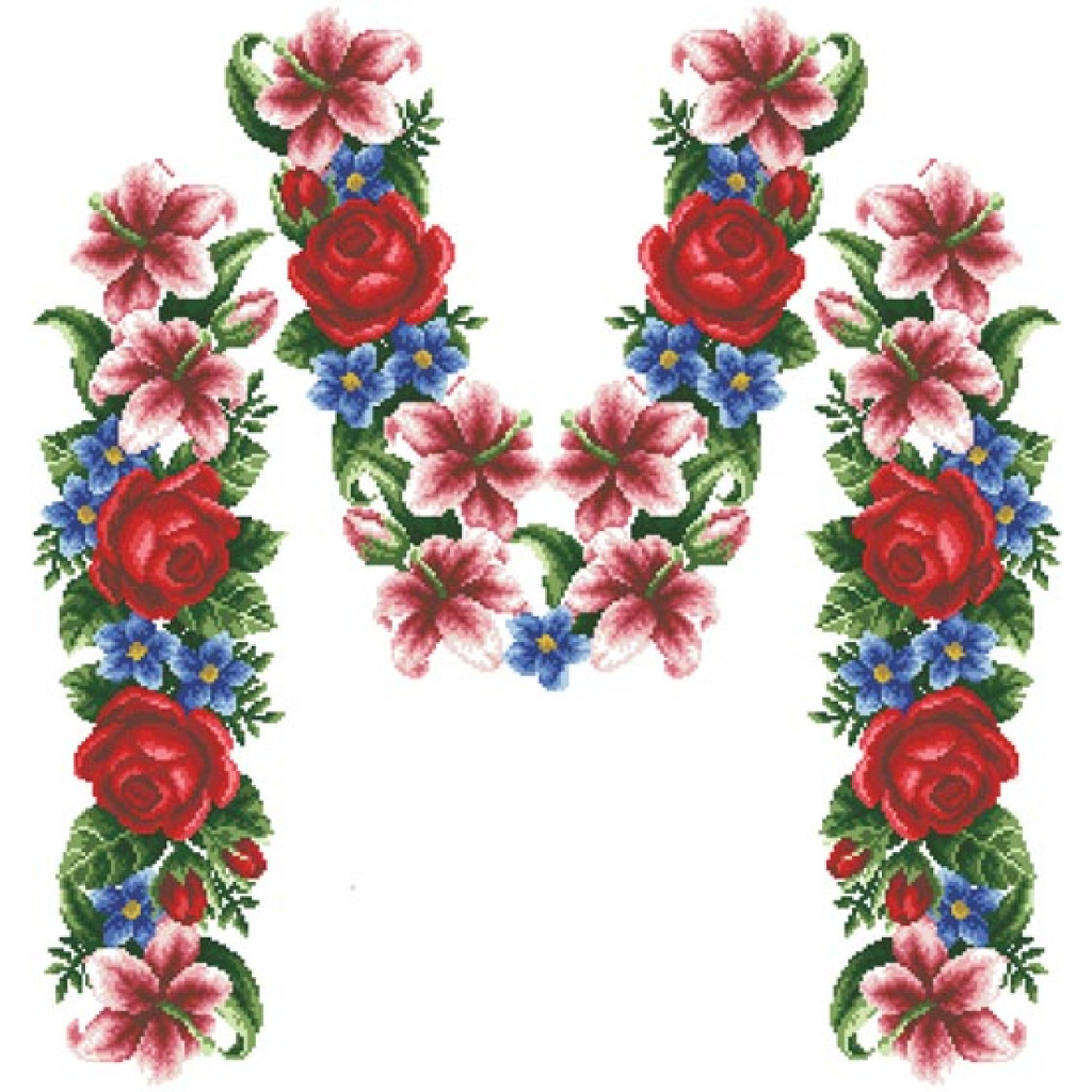 Заготовка для вишивки жіночої сукні Лілеї, троянди, незабудки призначена для часткової зашивки бісером або нитками. Схема надрукована на льоні білого кольору екологічно чистими стійкими фарбами, що не змиваються після прання. Відрізи розкроєні з урахуванням необхідних запасів для зручного вишивання та подальшого пошиття виробу.