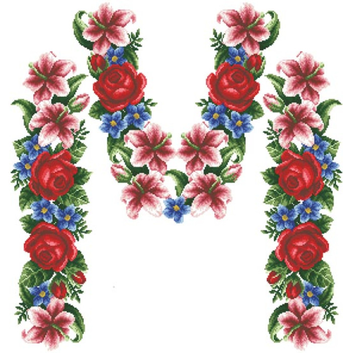 Заготовка для вишивки жіночої сукні Лілеї, троянди, незабудки призначена для часткової зашивки бісером або нитками. Схема надрукована на білому габардині екологічно чистими стійкими фарбами, що не змиваються після прання. Відрізи розкроєні з урахуванням необхідних запасів для зручного вишивання та подальшого пошиття виробу.