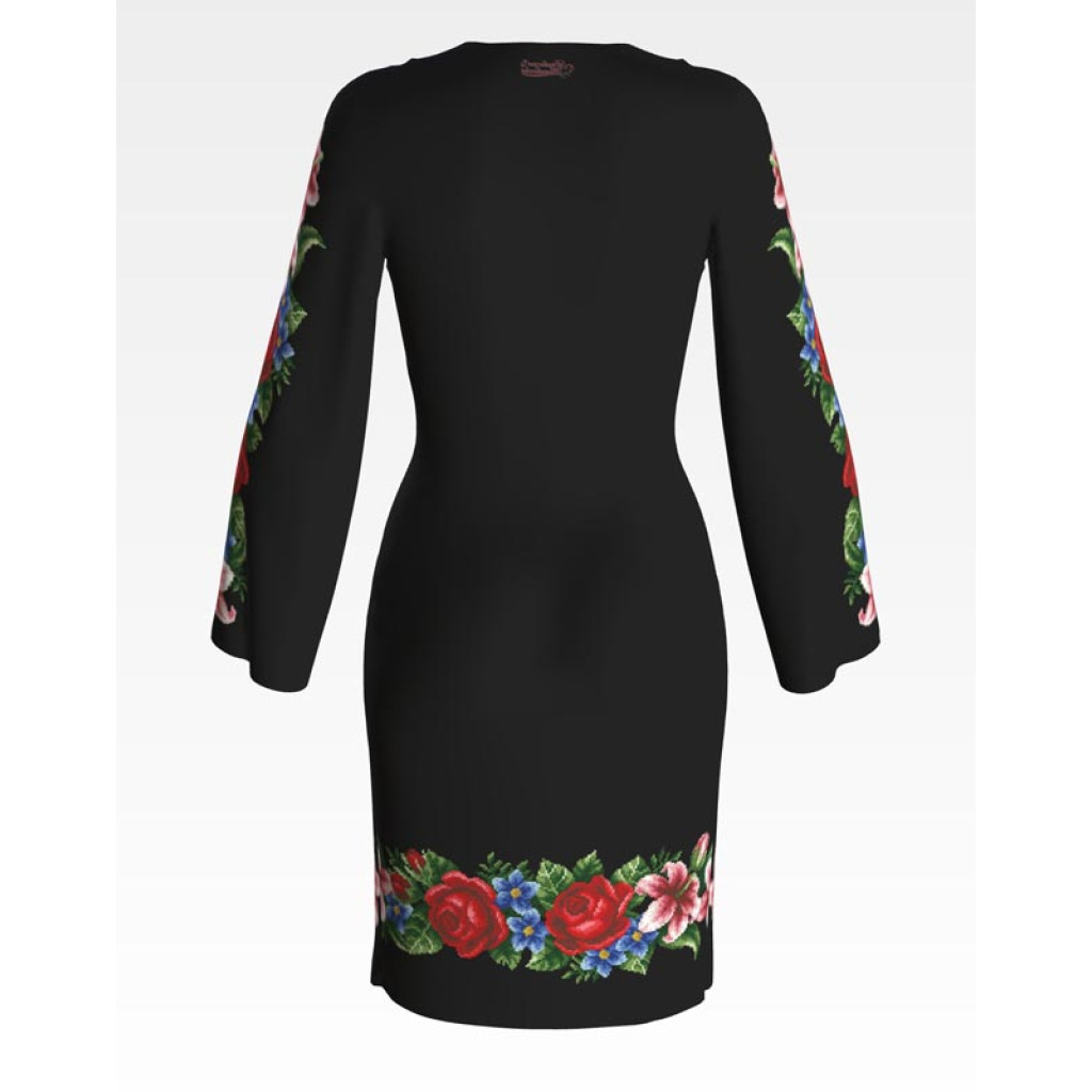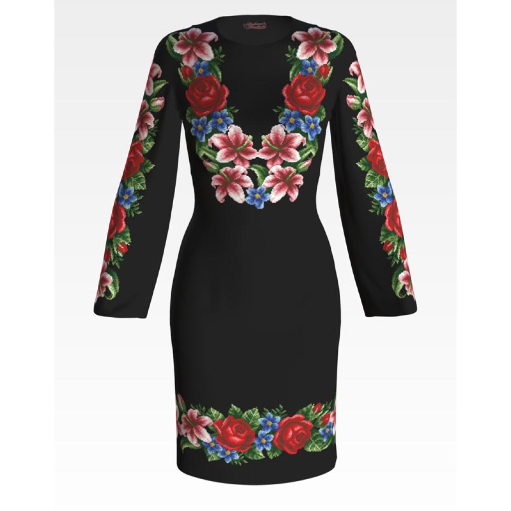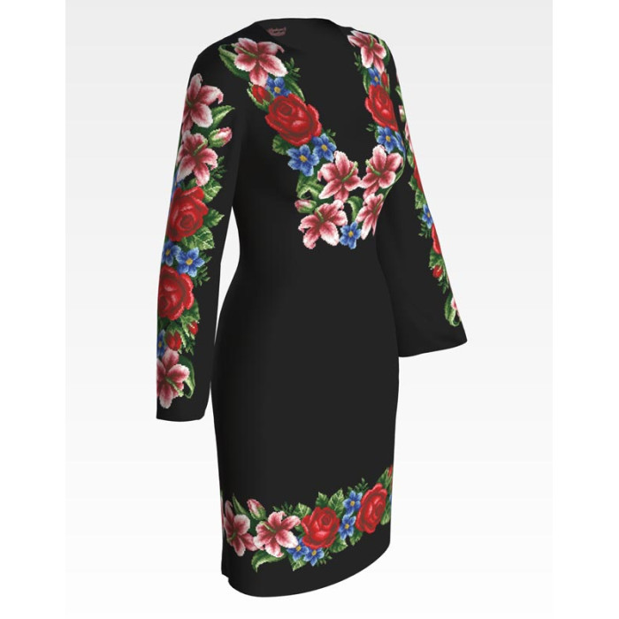 ПЛ055шЧнннн Барвиста вишиванка Заготовка для вишивки - Сукня жіноча Лілеї, троянди, незабудки р.42-54 шовк, чорний