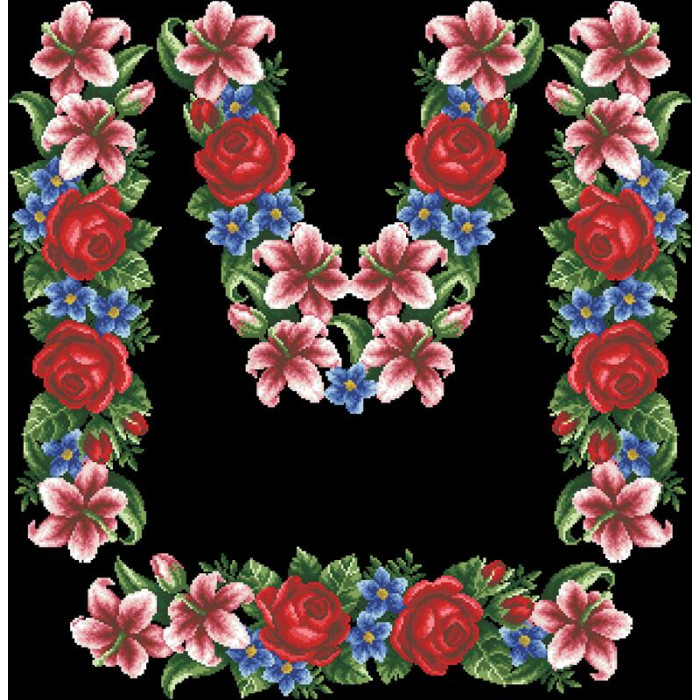 Заготовка для вишивки жіночої сукні Лілеї, троянди, незабудки призначена для часткової зашивки бісером або нитками. Схема надрукована на шовковій тканині чорного кольору екологічно чистими стійкими фарбами, що не змиваються після прання. Відрізи розкроєні з урахуванням запасів для зручного вишивання та подальшого пошиття виробу.