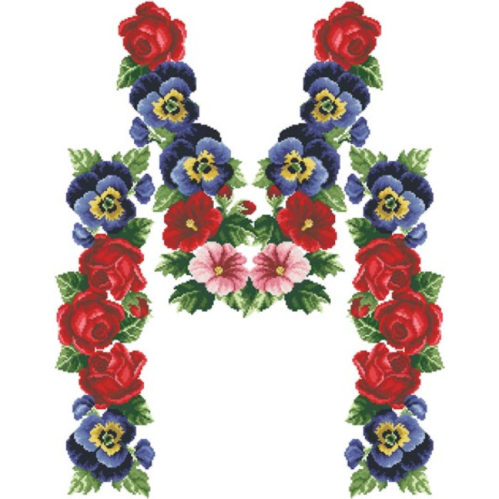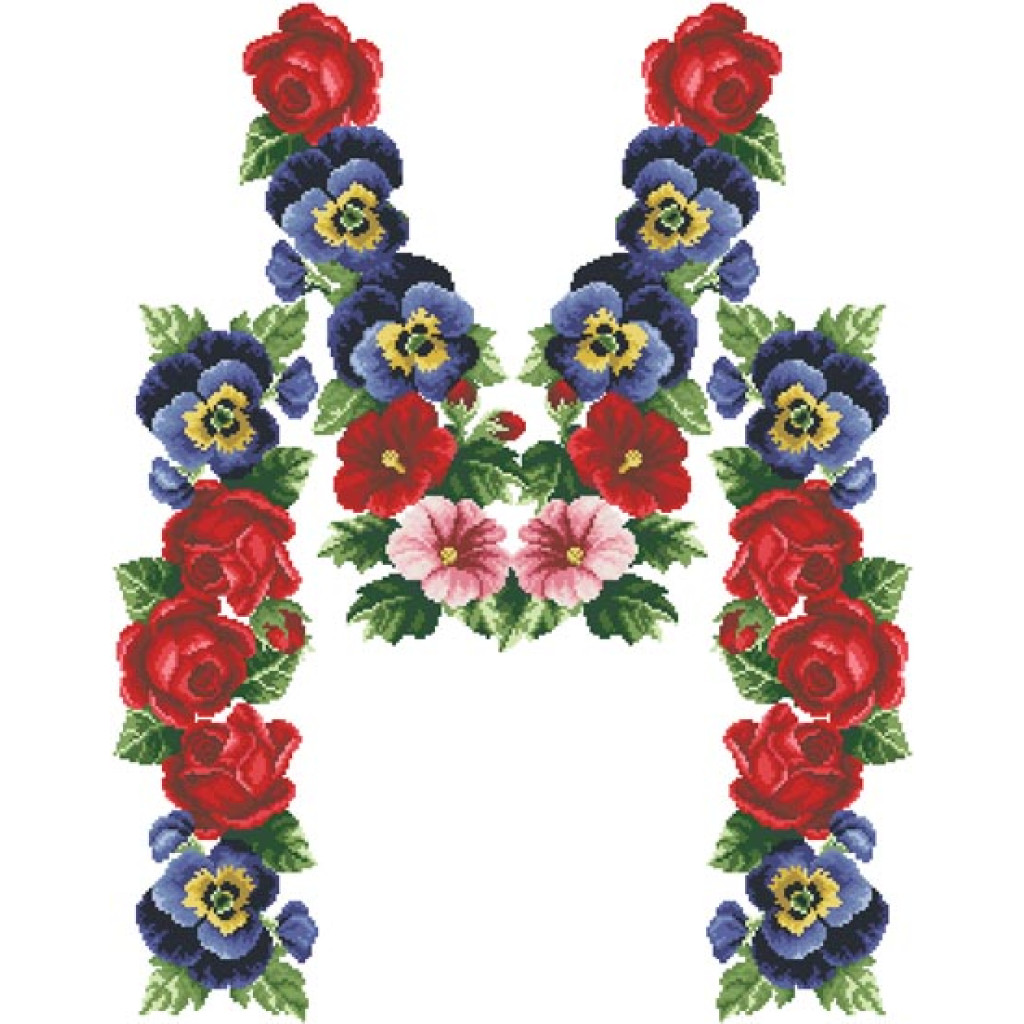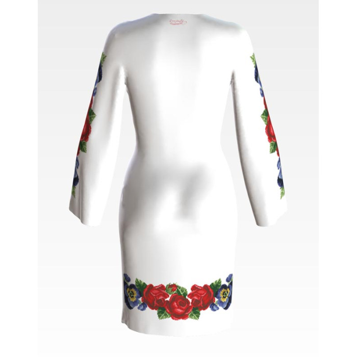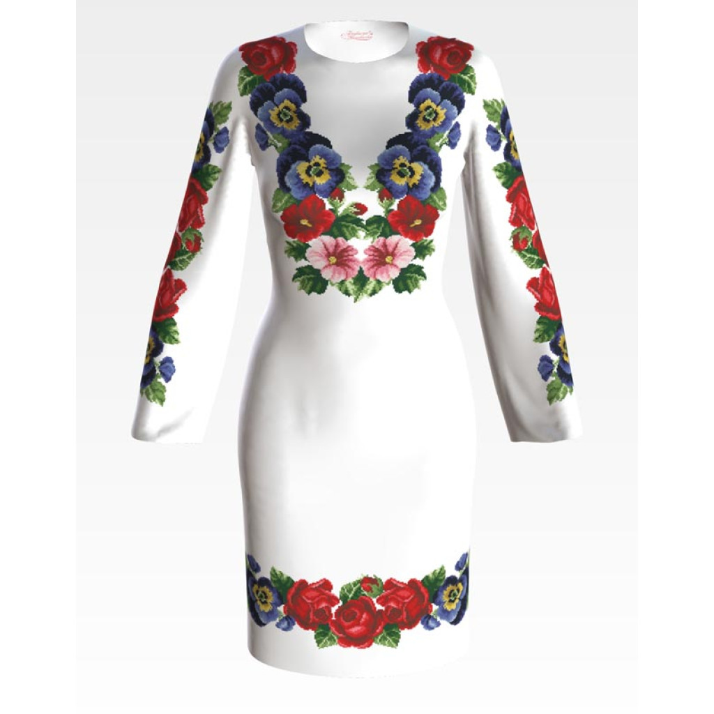 Заготовка для вишивки жіночої сукні Троянди, братки, мальви призначена для часткової зашивки бісером або нитками. Схема надрукована на білому габардині екологічно чистими стійкими фарбами, що не змиваються після прання. Відрізи розкроєні з урахуванням необхідних запасів для зручного вишивання та подальшого пошиття виробу.