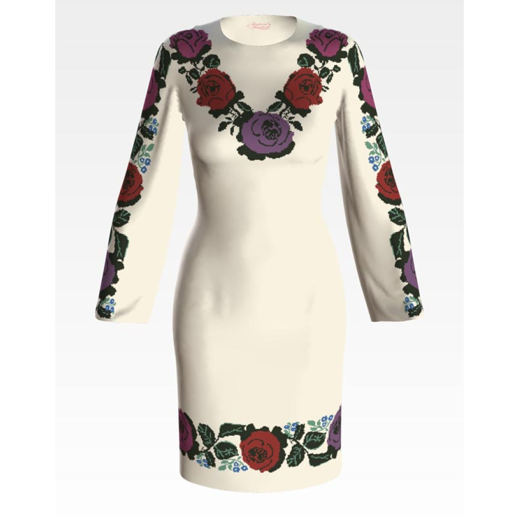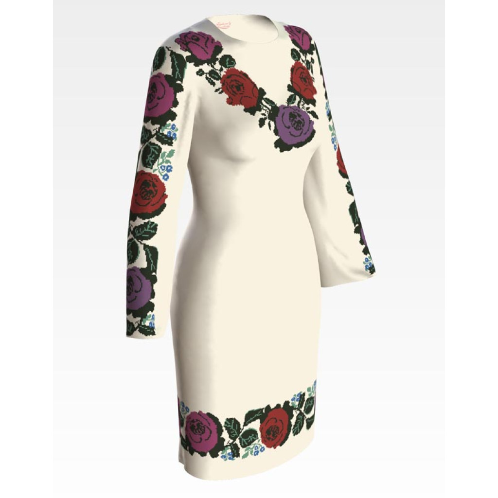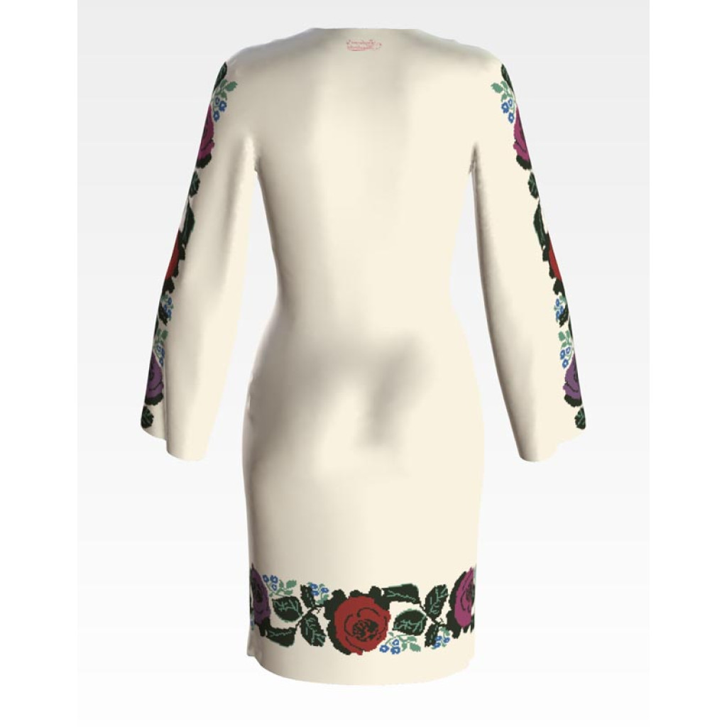 Заготовка для вишивки жіночої сукні Борщівська. Троянди призначена для часткової зашивки бісером або нитками. Схема надрукована на атлас-котоні бежевого кольору екологічно чистими стійкими фарбами, що не змиваються після прання. Відрізи розкроєні з урахуванням необхідних запасів для зручного вишивання та подальшого пошиття виробу.