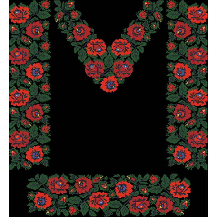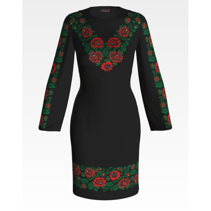 Заготовка для вишивки жіночої сукні Борщівська. Ніжні троянди призначена для часткової зашивки бісером або нитками. Схема надрукована на льоні чорного кольору екологічно чистими стійкими фарбами, що не змиваються після прання. Відрізи розкроєні з урахуванням необхідних запасів для зручного вишивання та подальшого пошиття виробу.