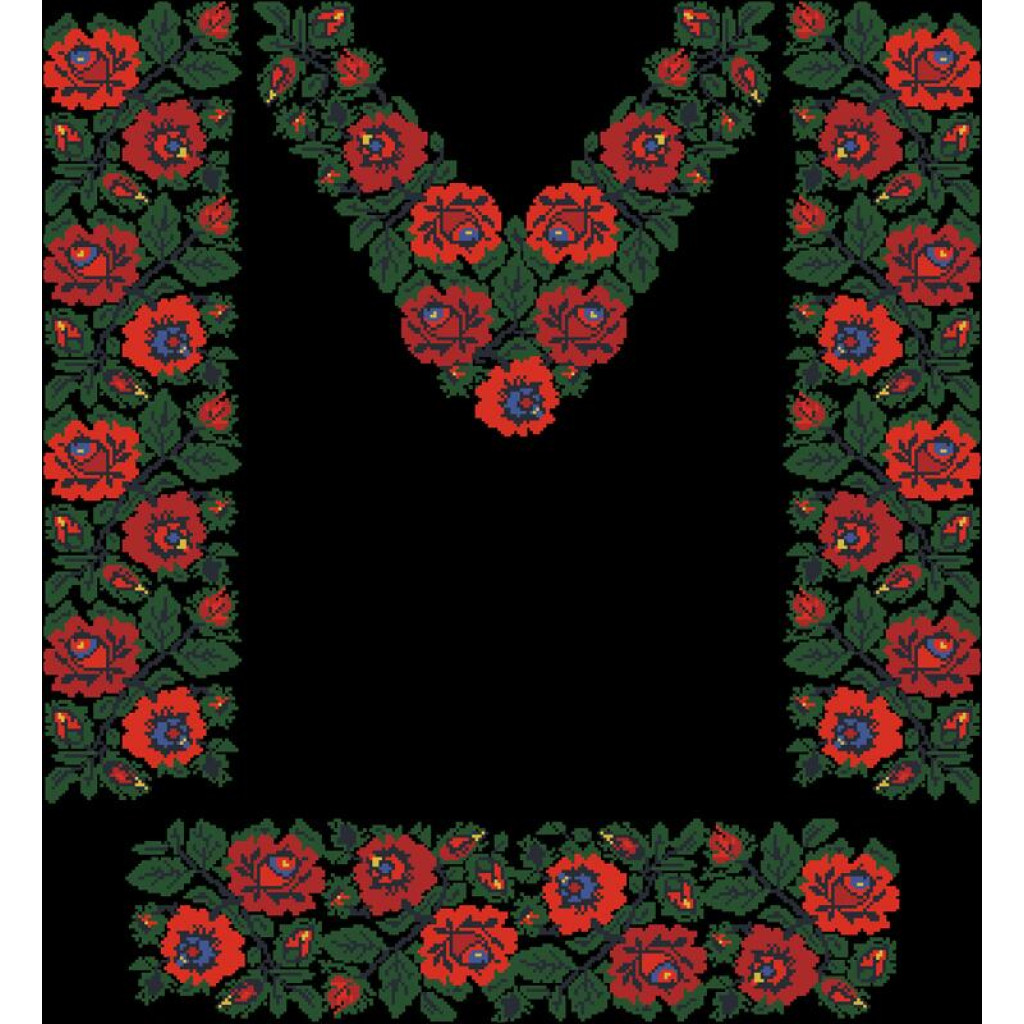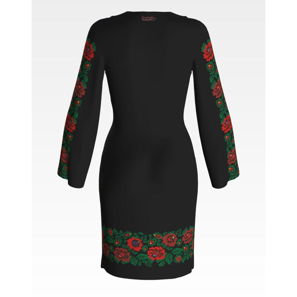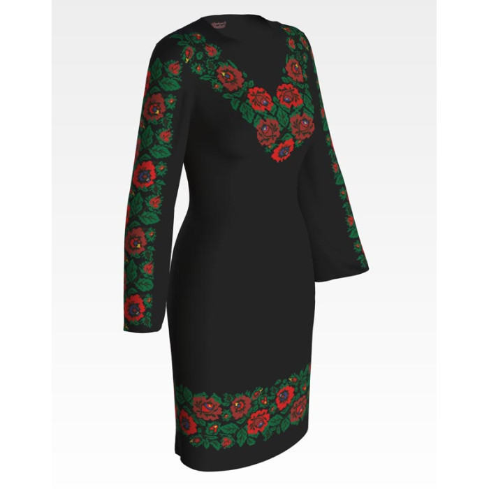 Заготовка для вишивки жіночої сукні Борщівська. Ніжні троянди призначена для часткової зашивки бісером або нитками. Схема надрукована на шовковій тканині чорного кольору екологічно чистими стійкими фарбами, що не змиваються після прання. Відрізи розкроєні з урахуванням запасів для зручного вишивання та подальшого пошиття виробу.