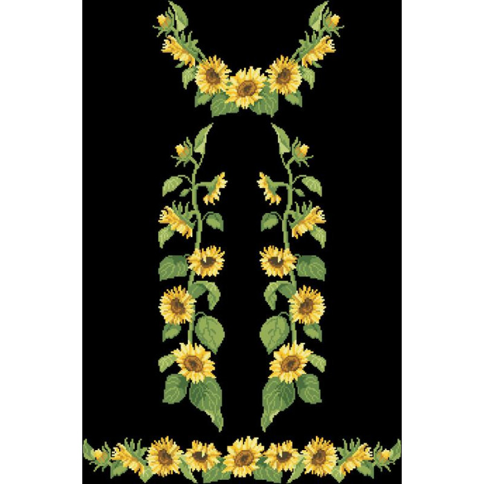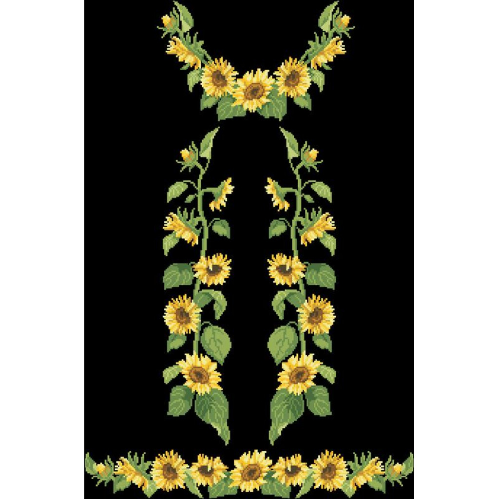 Заготовка для вишивки жіночої сукні Соняшники призначена для часткової зашивки бісером або нитками. Схема надрукована на льоні чорного кольору екологічно чистими стійкими фарбами, що не змиваються після прання. Відрізи розкроєні з урахуванням необхідних запасів для зручного вишивання та подальшого пошиття виробу.