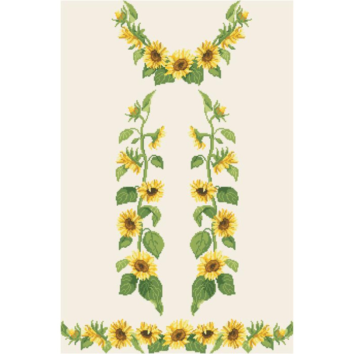 Заготовка для вишивки жіночої сукні Соняшники призначена для часткової зашивки бісером або нитками. Схема надрукована на льоні бежевого кольору екологічно чистими стійкими фарбами, що не змиваються після прання. Відрізи розкроєні з урахуванням необхідних запасів для зручного вишивання та подальшого пошиття виробу.