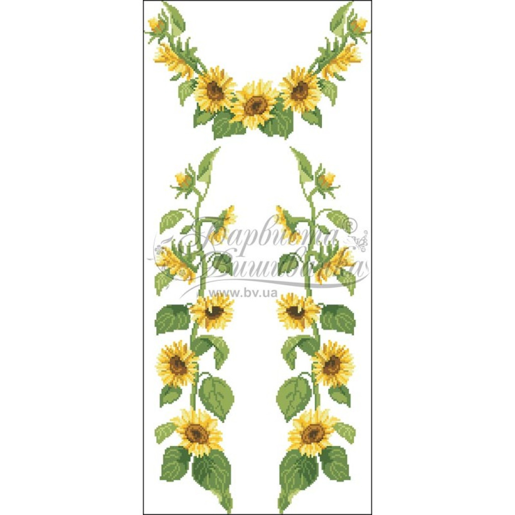 Заготовка для вишивки жіночої сукні Соняшники призначена для часткової зашивки бісером або нитками. Схема надрукована на білому габардині екологічно чистими стійкими фарбами, що не змиваються після прання. Відрізи розкроєні з урахуванням необхідних запасів для зручного вишивання та подальшого пошиття виробу.