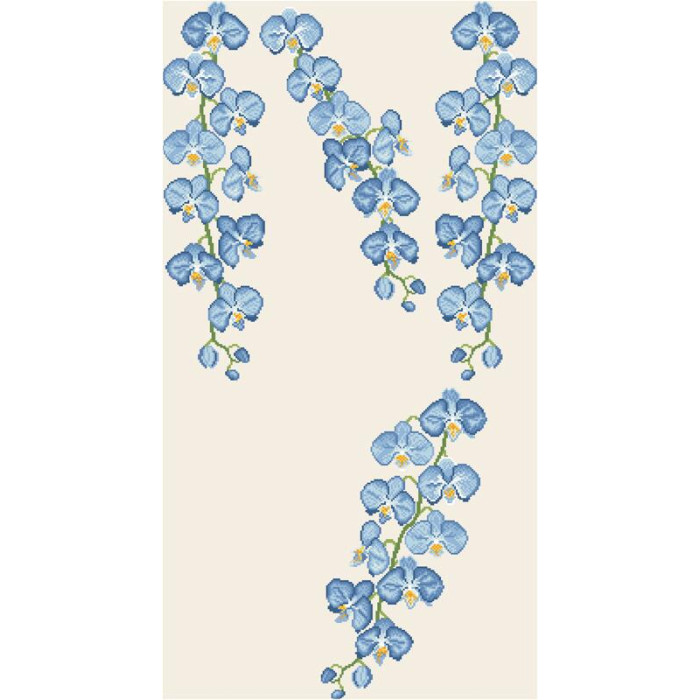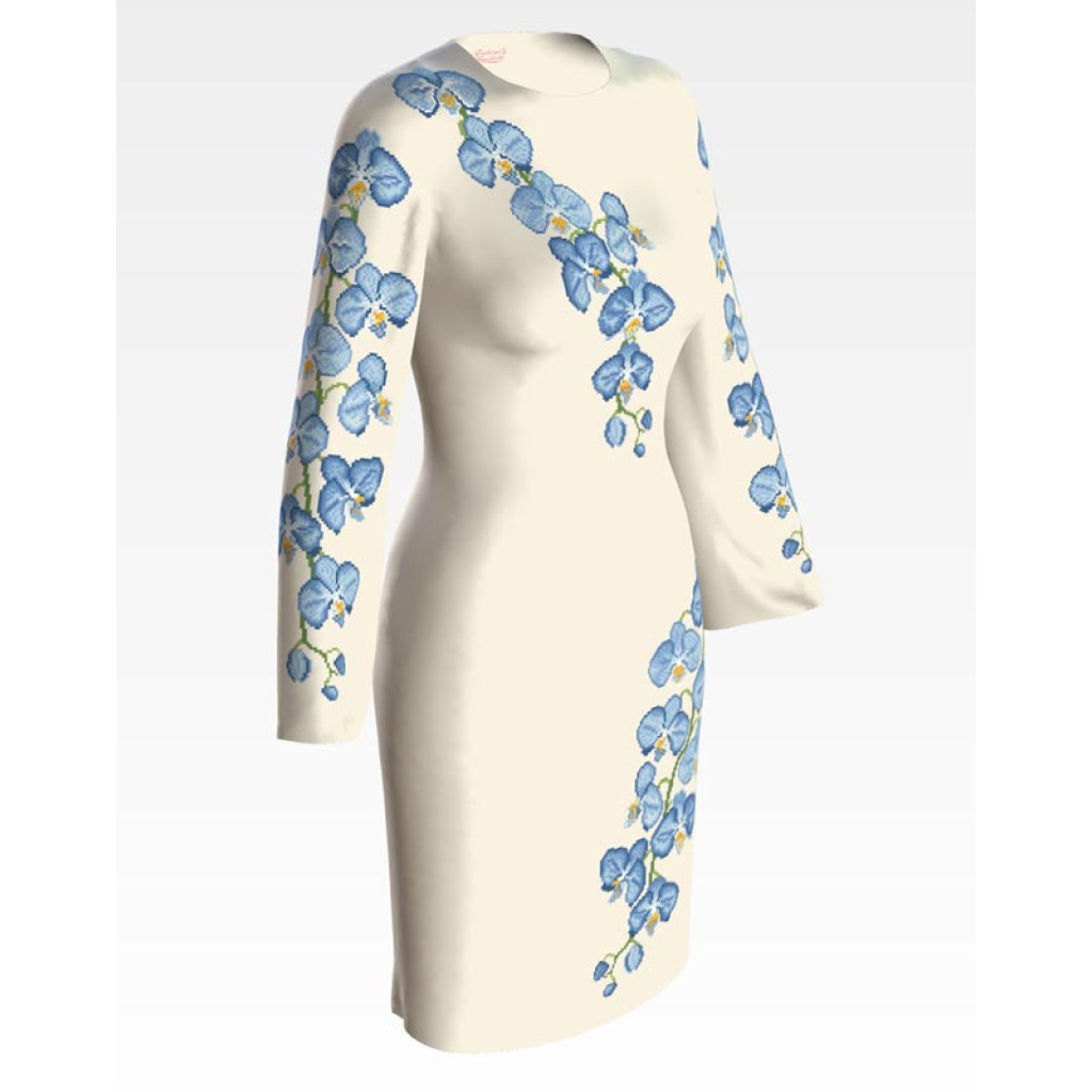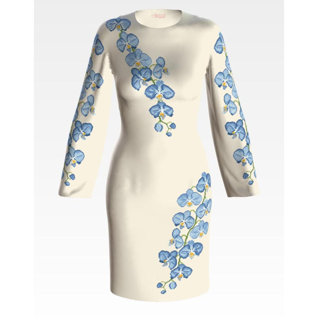 Заготовка для вишивки жіночої сукні Блакитні орхідеї призначена для часткової зашивки бісером або нитками. Схема надрукована на атлас-котоні бежевого кольору екологічно чистими стійкими фарбами, що не змиваються після прання. Відрізи розкроєні з урахуванням необхідних запасів для зручного вишивання та подальшого пошиття виробу.