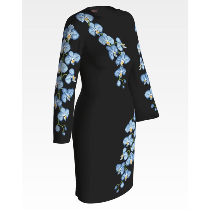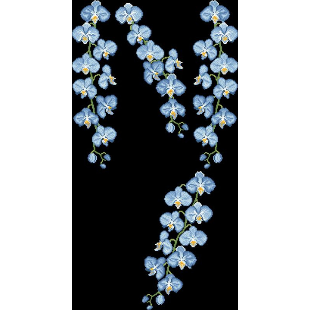 Заготовка для вишивки жіночої сукні Блакитні орхідеї призначена для часткової зашивки бісером або нитками. Схема надрукована на льоні чорного кольору екологічно чистими стійкими фарбами, що не змиваються після прання. Відрізи розкроєні з урахуванням необхідних запасів для зручного вишивання та подальшого пошиття виробу.