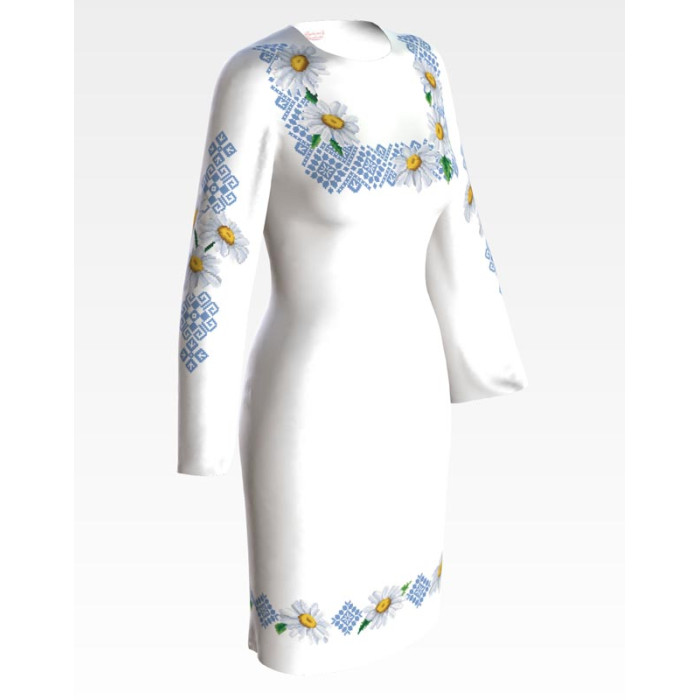 Заготовка для вишивки жіночої сукні Ніжні ромашки призначена для часткової зашивки бісером або нитками. Схема надрукована на льоні білого кольору екологічно чистими стійкими фарбами, що не змиваються після прання. Відрізи розкроєні з урахуванням необхідних запасів для зручного вишивання та подальшого пошиття виробу.