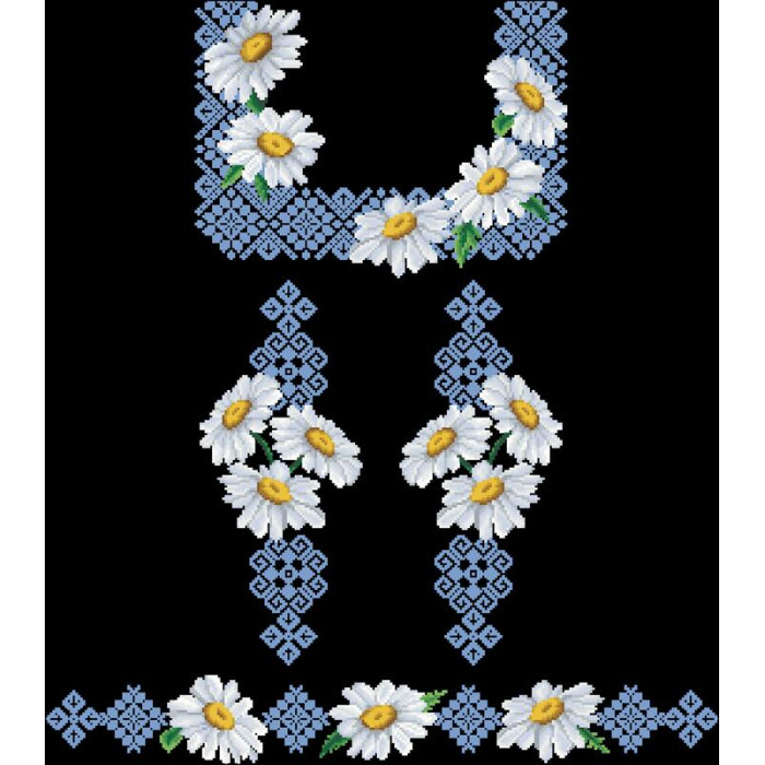 Заготовка для вишивки жіночої сукні Ніжні ромашки призначена для часткової зашивки бісером або нитками. Схема надрукована на льоні чорного кольору екологічно чистими стійкими фарбами, що не змиваються після прання. Відрізи розкроєні з урахуванням необхідних запасів для зручного вишивання та подальшого пошиття виробу.
