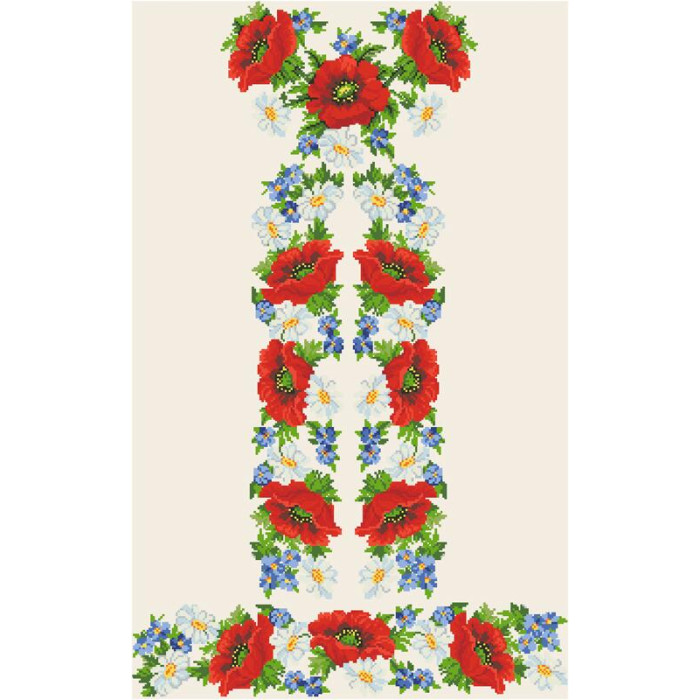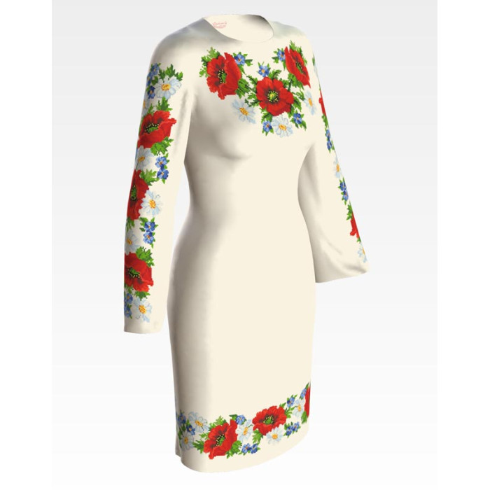 Заготовка для вишивки жіночої сукні Маки, ромашки, незабудки призначена для часткової зашивки бісером або нитками. Схема надрукована на льоні бежевого кольору екологічно чистими стійкими фарбами, що не змиваються після прання. Відрізи розкроєні з урахуванням необхідних запасів для зручного вишивання та подальшого пошиття виробу.