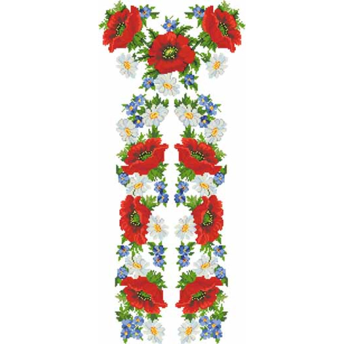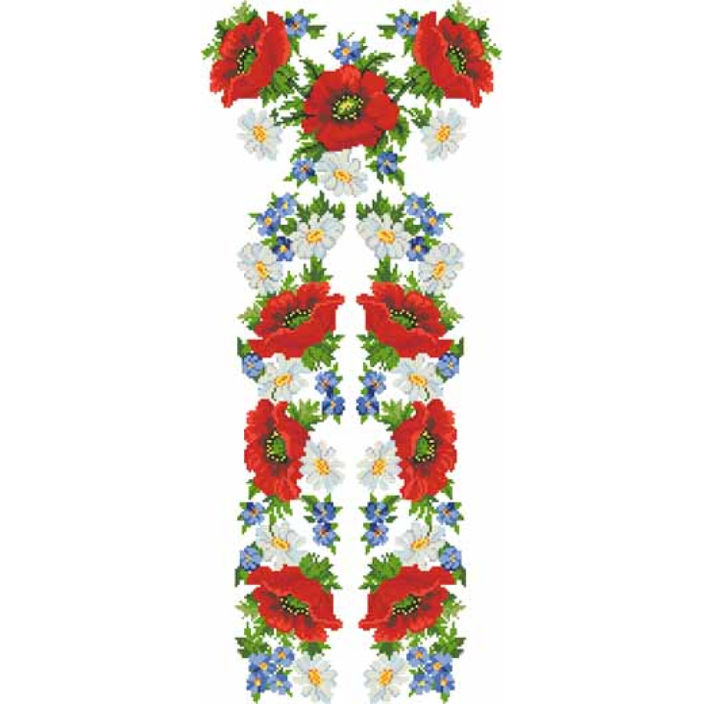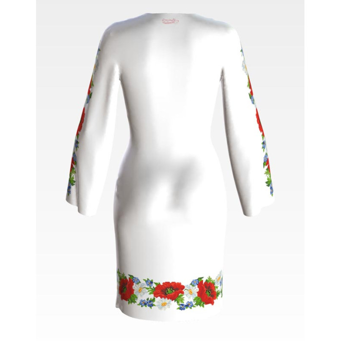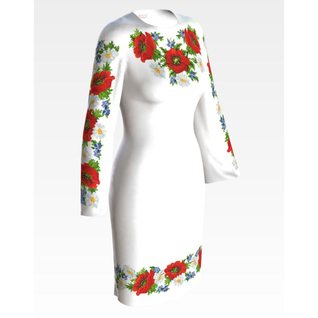 Заготовка для вишивки жіночої сукні Маки, ромашки, незабудки призначена для часткової зашивки бісером або нитками. Схема надрукована на білому габардині екологічно чистими стійкими фарбами, що не змиваються після прання. Відрізи розкроєні з урахуванням необхідних запасів для зручного вишивання та подальшого пошиття виробу.