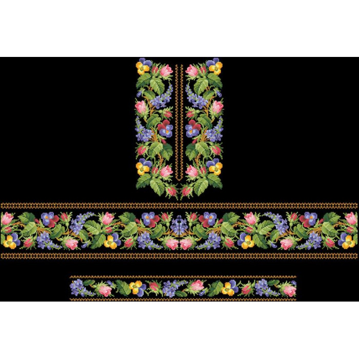 Заготовка для вишивки жіночої сукні Колоритні братки призначена для часткової зашивки бісером або нитками. Схема надрукована на шовковій тканині чорного кольору екологічно чистими стійкими фарбами, що не змиваються після прання. Відрізи розкроєні з урахуванням запасів для зручного вишивання та подальшого пошиття виробу.