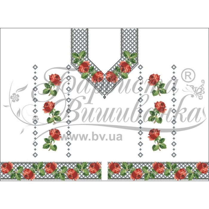 Заготовка для вишивки жіночої сукні Трояндове мереживо призначена для часткової зашивки бісером або нитками. Схема надрукована на білому габардині екологічно чистими стійкими фарбами, що не змиваються після прання. Відрізи розкроєні з урахуванням необхідних запасів для зручного вишивання та подальшого пошиття виробу.