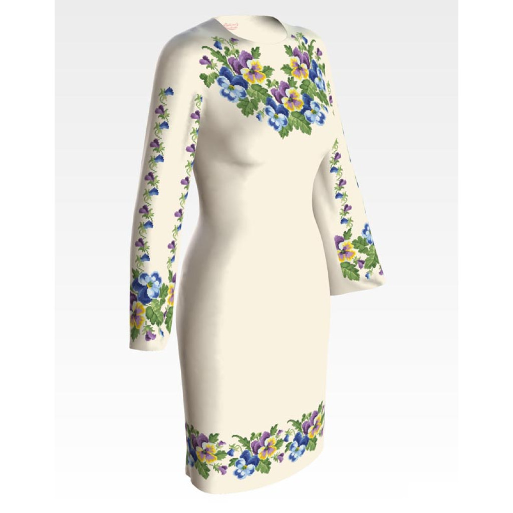 Заготовка для вишивки жіночої сукні Елегантні братки призначена для часткової зашивки бісером або нитками. Схема надрукована на атлас-котоні бежевого кольору екологічно чистими стійкими фарбами, що не змиваються після прання. Відрізи розкроєні з урахуванням необхідних запасів для зручного вишивання та подальшого пошиття виробу.