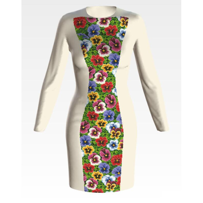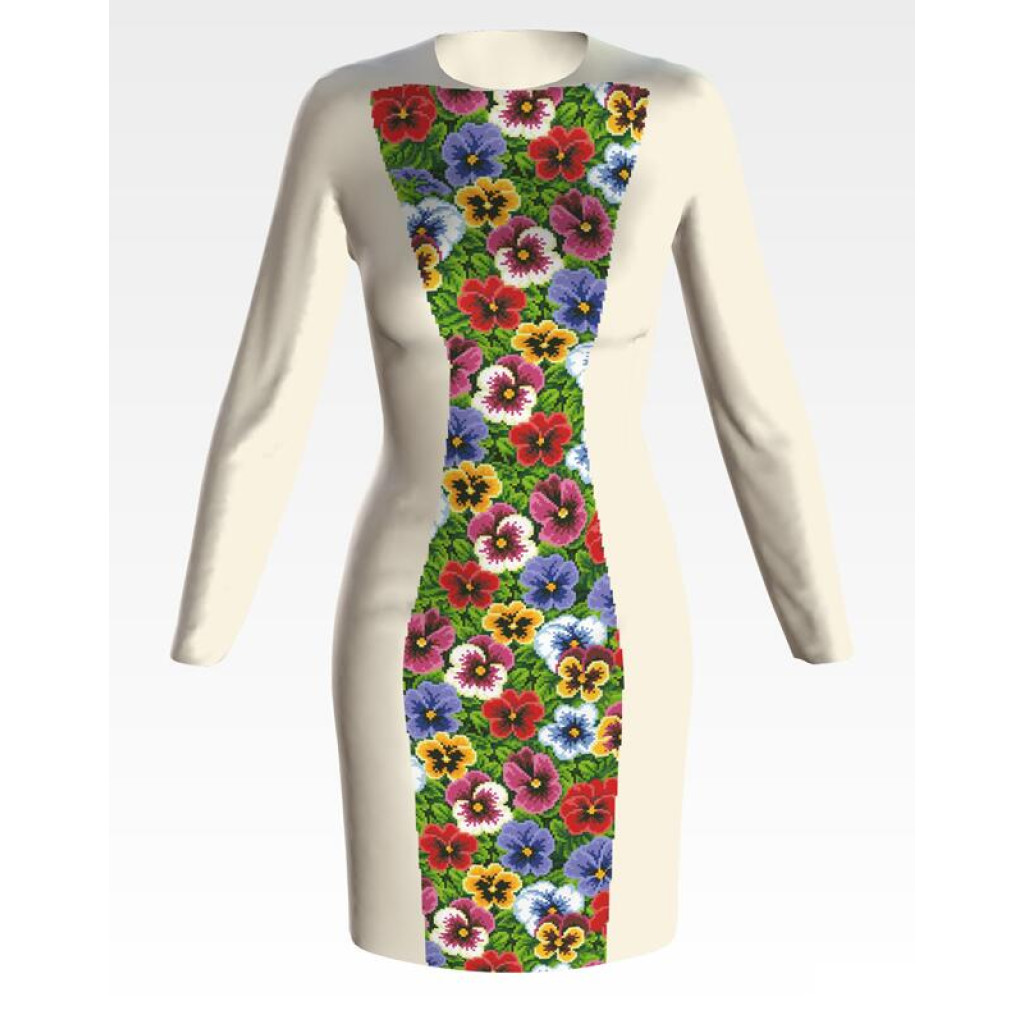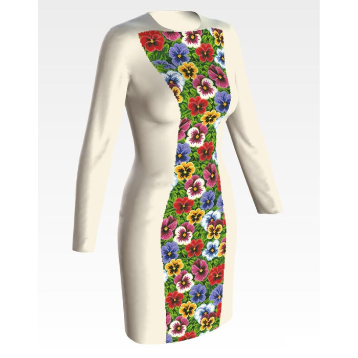 Заготовка для вишивки жіночої сукні Мальовничі братки призначена для часткової зашивки бісером або нитками. Схема надрукована на домотканому полотні бежевого кольору екологічно чистими стійкими фарбами, що не змиваються після прання. Відрізи розкроєні з урахуванням необхідних запасів для зручного вишивання та подальшого пошиття виробу.