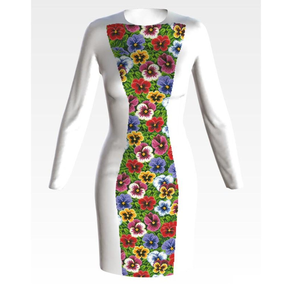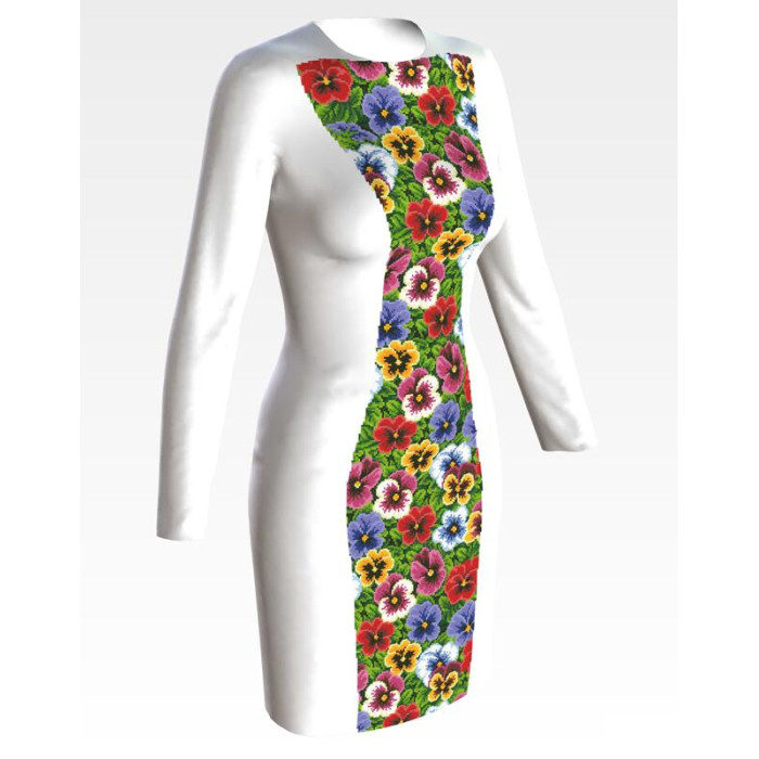 Заготовка для вишивки жіночої сукні Мальовничі братки призначена для часткової зашивки бісером або нитками. Схема надрукована на білому габардині екологічно чистими стійкими фарбами, що не змиваються після прання. Відрізи розкроєні з урахуванням необхідних запасів для зручного вишивання та подальшого пошиття виробу.