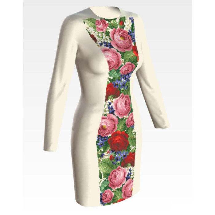 Заготовка для вишивки жіночої сукні Розкішні троянди, фіалки, конвалії призначена для часткової зашивки бісером або нитками. Схема надрукована на атлас-котоні бежевого кольору екологічно чистими стійкими фарбами, що не змиваються після прання. Відрізи розкроєні з урахуванням необхідних запасів для зручного вишивання та подальшого пошиття виробу.
