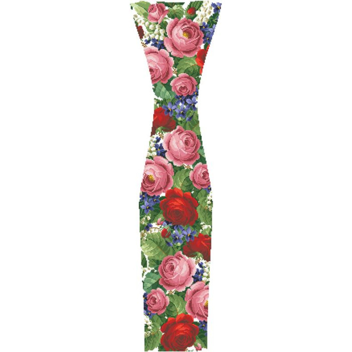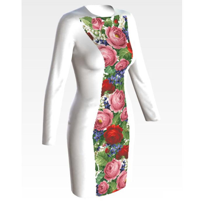 Заготовка для вишивки жіночої сукні Розкішні троянди, фіалки, конвалії призначена для часткової зашивки бісером або нитками. Схема надрукована на білому габардині екологічно чистими стійкими фарбами, що не змиваються після прання. Відрізи розкроєні з урахуванням необхідних запасів для зручного вишивання та подальшого пошиття виробу.