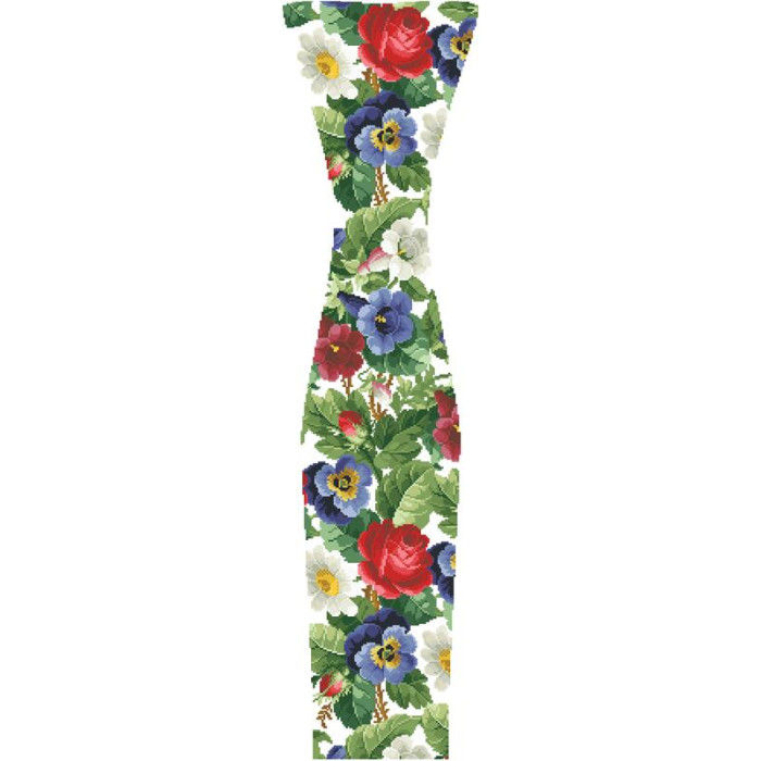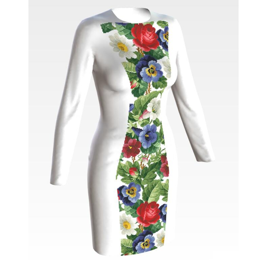 Заготовка для вишивки жіночої сукні Троянди, братки, петунії, ромашки призначена для часткової зашивки бісером або нитками. Схема надрукована на білому габардині екологічно чистими стійкими фарбами, що не змиваються після прання. Відрізи розкроєні з урахуванням необхідних запасів для зручного вишивання та подальшого пошиття виробу.