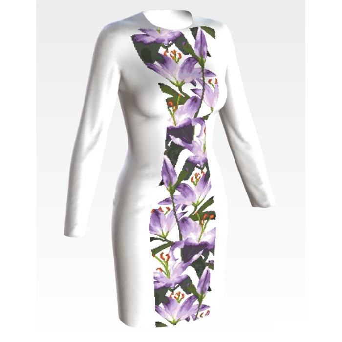 Заготовка для вишивки жіночої сукні Місячні лілії призначена для часткової зашивки бісером або нитками. Схема надрукована на білому габардині екологічно чистими стійкими фарбами, що не змиваються після прання. Відрізи розкроєні з урахуванням необхідних запасів для зручного вишивання та подальшого пошиття виробу.