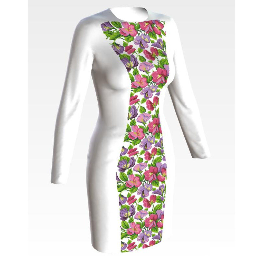 Заготовка для вишивки жіночої сукні Фіалки призначена для часткової зашивки бісером або нитками. Схема надрукована на домотканому полотні білого кольору екологічно чистими стійкими фарбами, що не змиваються після прання. Відрізи розкроєні з урахуванням необхідних запасів для зручного вишивання та подальшого пошиття виробу.