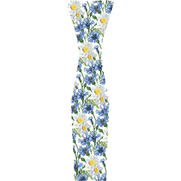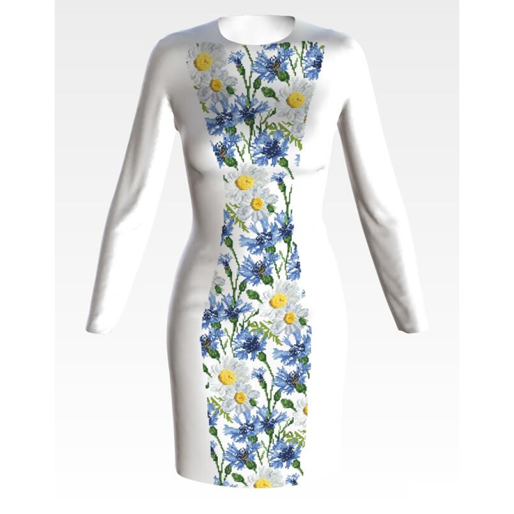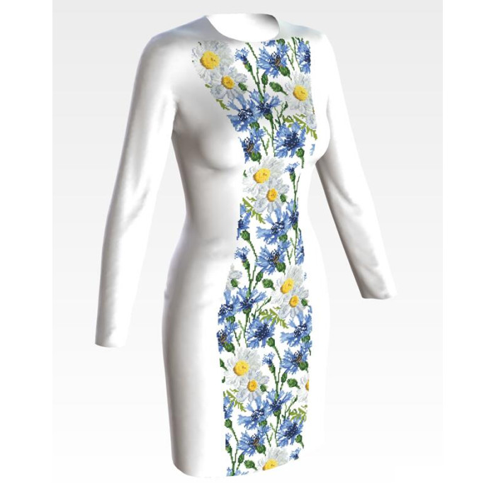Заготовка для вишивки жіночої сукні Волошки і ромашки призначена для часткової зашивки бісером або нитками. Схема надрукована на білому габардині екологічно чистими стійкими фарбами, що не змиваються після прання. Відрізи розкроєні з урахуванням необхідних запасів для зручного вишивання та подальшого пошиття виробу.