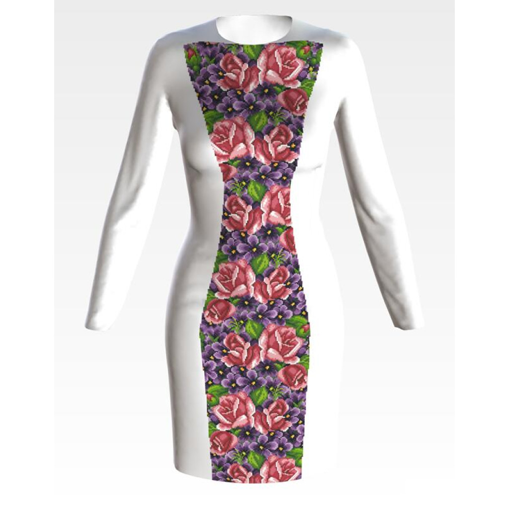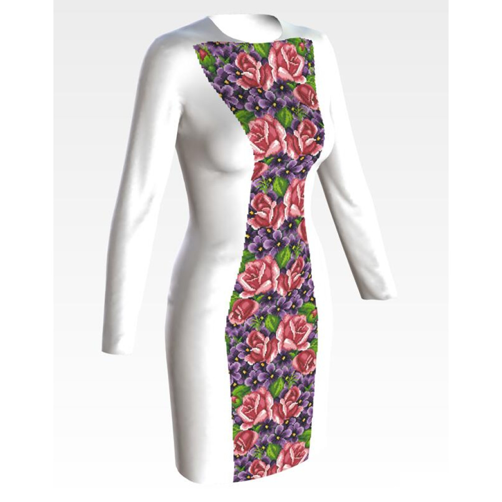 Заготовка для вишивки жіночої сукні Фіалки і троянди призначена для часткової зашивки бісером або нитками. Схема надрукована на білому габардині екологічно чистими стійкими фарбами, що не змиваються після прання. Відрізи розкроєні з урахуванням необхідних запасів для зручного вишивання та подальшого пошиття виробу.