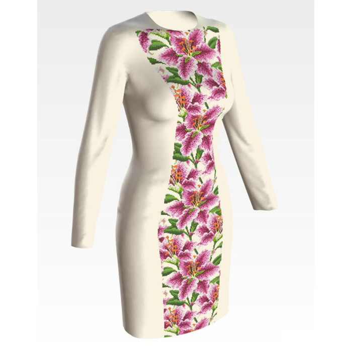 Заготовка для вишивки жіночої сукні Розкішні лілії призначена для часткової зашивки бісером або нитками. Схема надрукована на атлас-котоні бежевого кольору екологічно чистими стійкими фарбами, що не змиваються після прання. Відрізи розкроєні з урахуванням необхідних запасів для зручного вишивання та подальшого пошиття виробу.