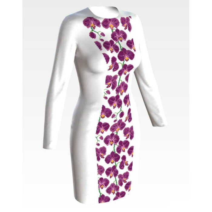 Заготовка для вишивки жіночої сукні Орхідеї кольору фуксії призначена для часткової зашивки бісером або нитками. Схема надрукована на білому габардині екологічно чистими стійкими фарбами, що не змиваються після прання. Відрізи розкроєні з урахуванням необхідних запасів для зручного вишивання та подальшого пошиття виробу.