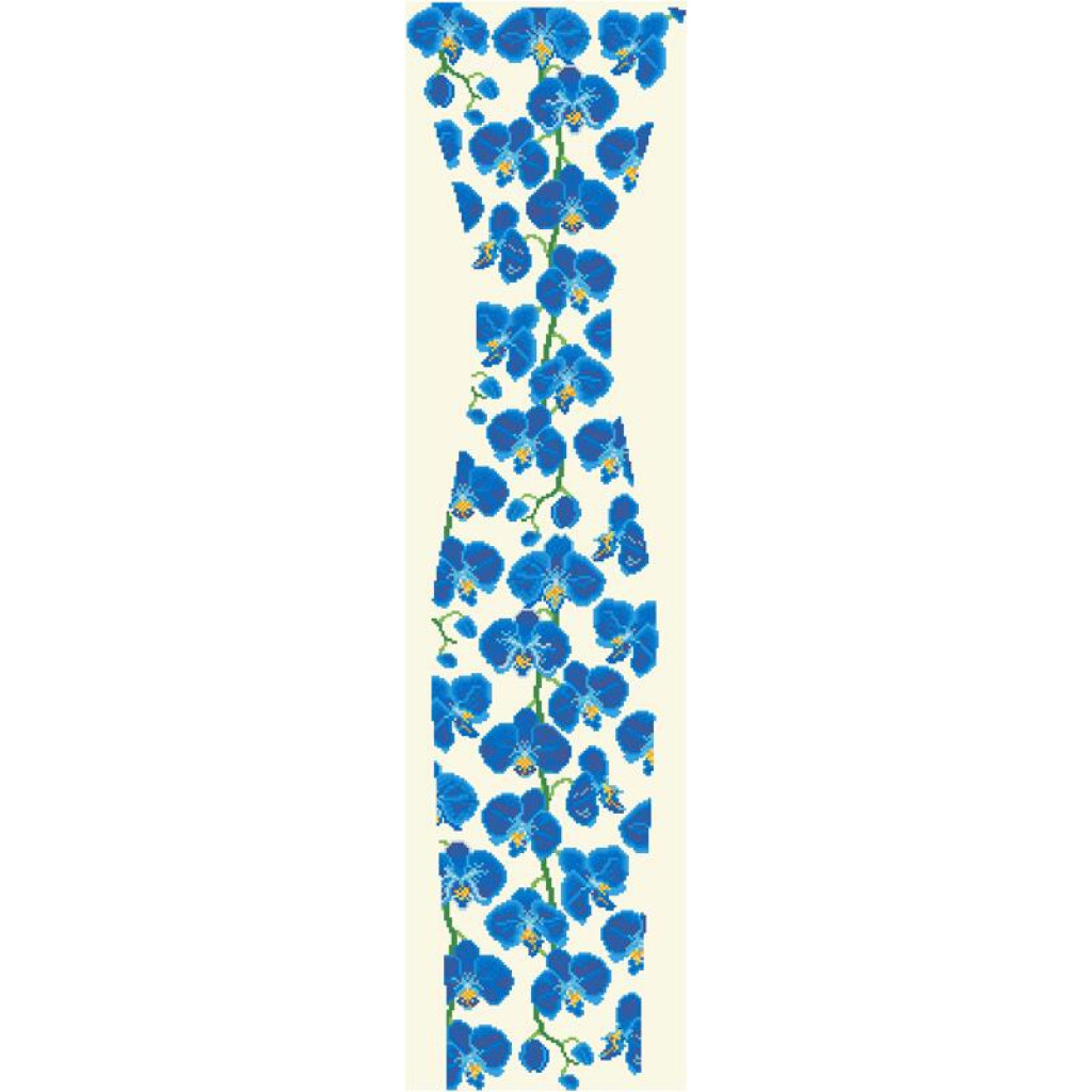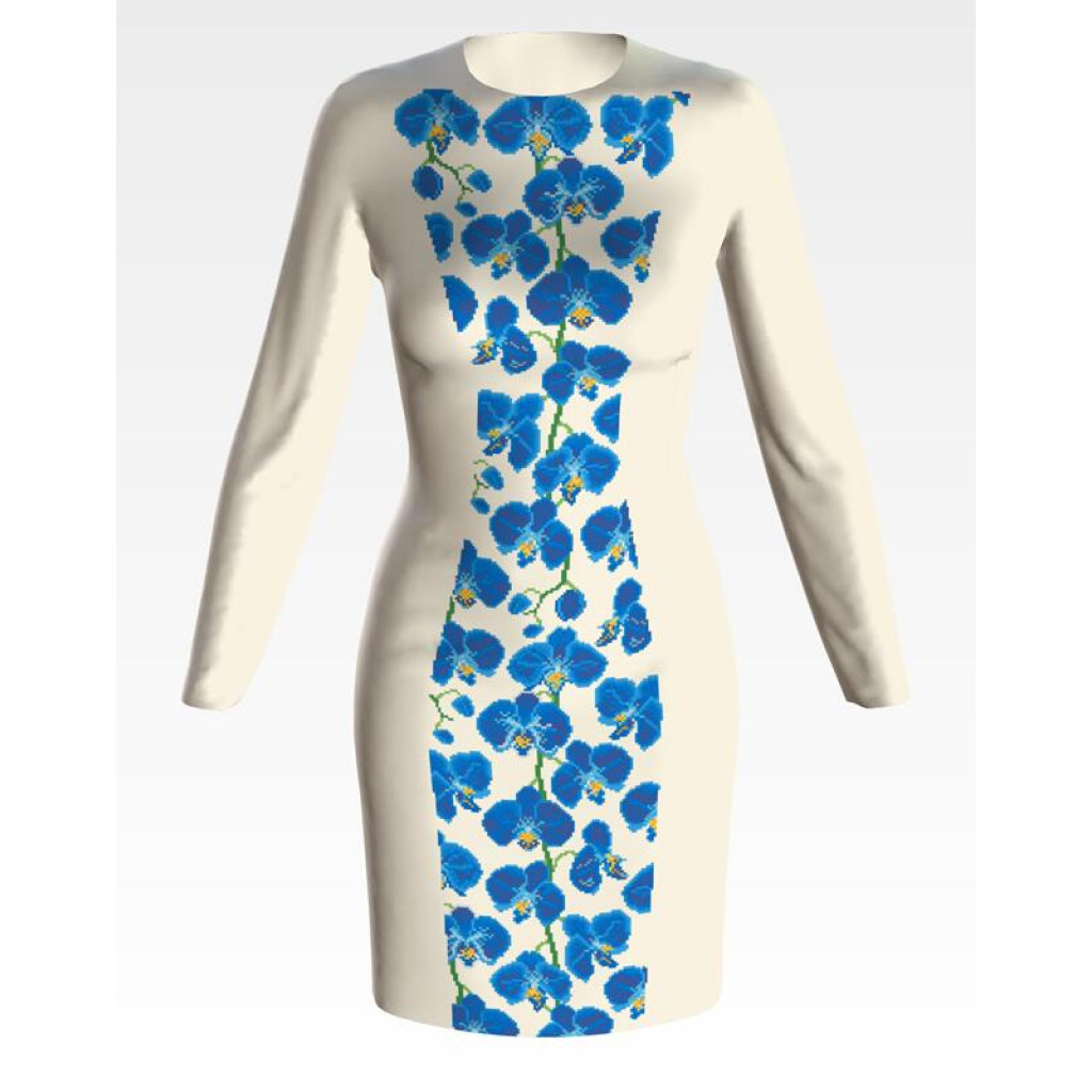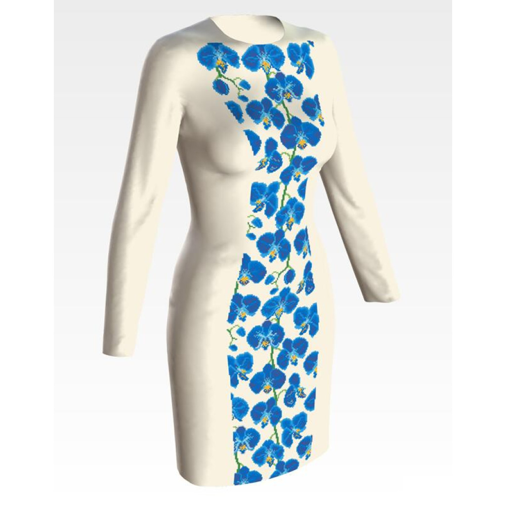 Заготовка для вишивки жіночої сукні Сині орхідеї призначена для часткової зашивки бісером або нитками. Схема надрукована на атлас-котоні бежевого кольору екологічно чистими стійкими фарбами, що не змиваються після прання. Відрізи розкроєні з урахуванням необхідних запасів для зручного вишивання та подальшого пошиття виробу.