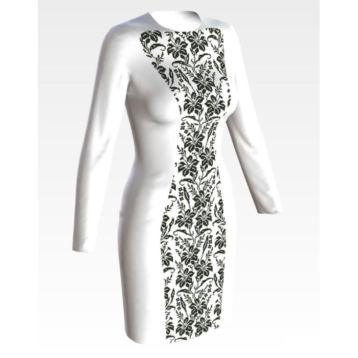 Заготовка для вишивки жіночої сукні Лілії. Орнамент призначена для часткової зашивки бісером або нитками. Схема надрукована на домотканому полотні білого кольору екологічно чистими стійкими фарбами, що не змиваються після прання. Відрізи розкроєні з урахуванням необхідних запасів для зручного вишивання та подальшого пошиття виробу.
